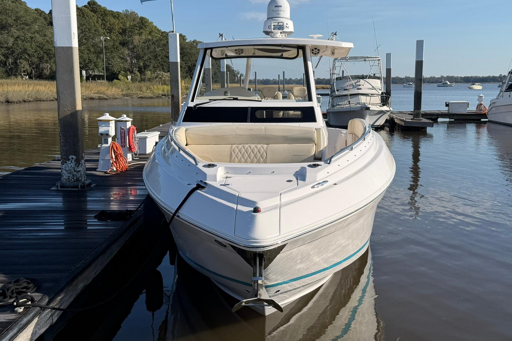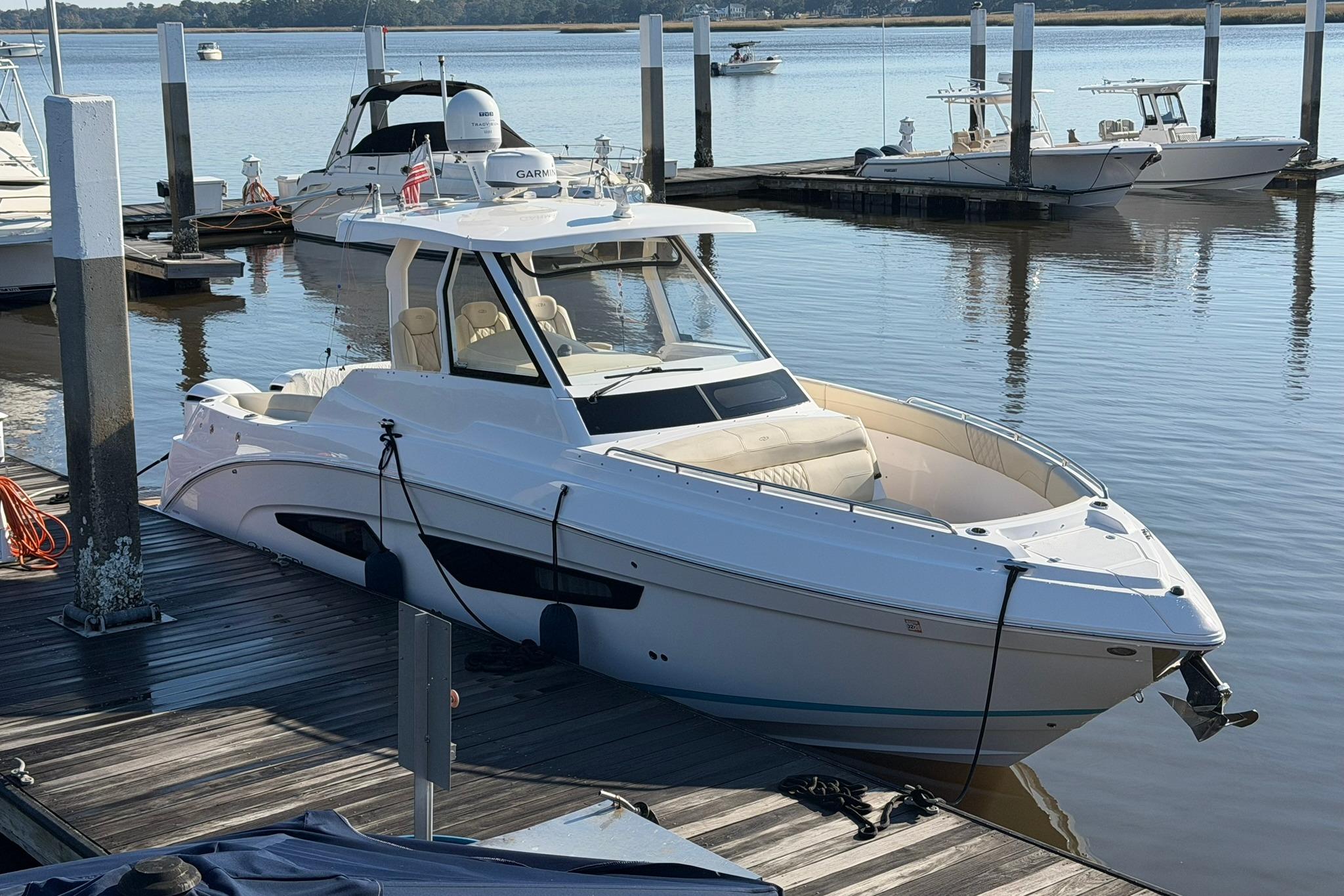 This Regal 33 SAV is ready to fish and priced to sell. Lift stored and no bottom paint. Recent detail and full engine and generator service. Regular detailing results in no oxidation and regular engine maintenance gives peace of mind. It is White with the Bimini Blue Bootstripe and has the twin Yamaha F300 with Optimus 360 Joystick control. In addition to its many standard features it has the following long list of options. Shore power with AC and Heat, Anchor Windlass, Bow Sunshade, Fish Package, Bow Table with Filler, Helm Enclosure, Cockpit Grill, Cockpit Refrigerator, Cockpit Sunshade, Fender Clips, Flag Pole, Garmin Closed Radar/VHF/Autopilot, Dual Garmin 7612 Screens w/B60 transducer, Generator, Ski Pylon, KVH, Cockpit and Cabin TV, Toilet Overboard Discharge, Top Gun Outriggers, Cockpit and Swim Platform Flexiteek flooring. This one won\’t last long at this price!