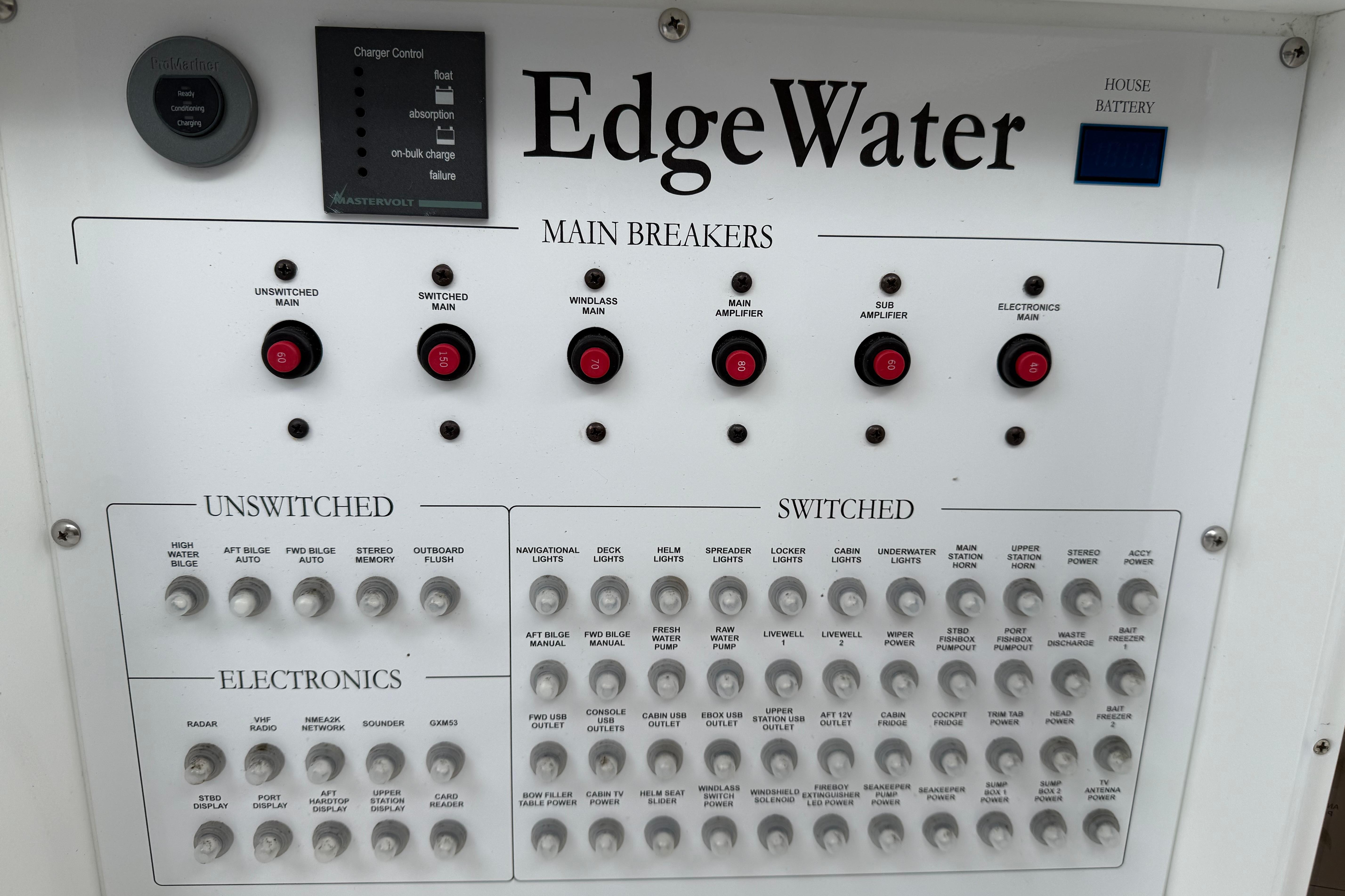 - Dedicated House Battery Charger & a Dedicated Engine Battery Charger (3 Bank) w/ Shore Power Inlet, Circuit Breaker & Cord House/Engine Battery System w/ On-Off Switches (3), Battery Isolator & Console Parallel Switch