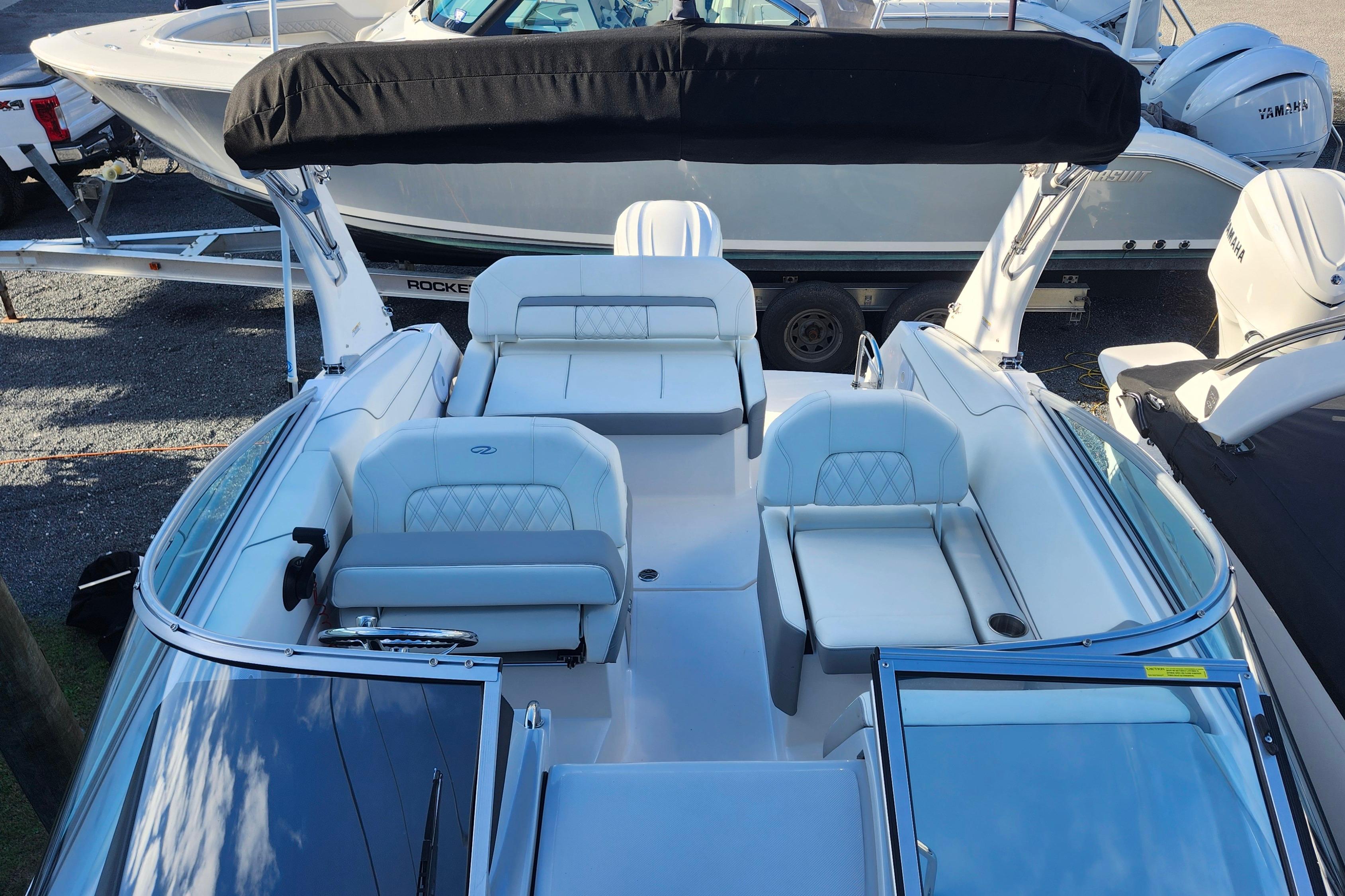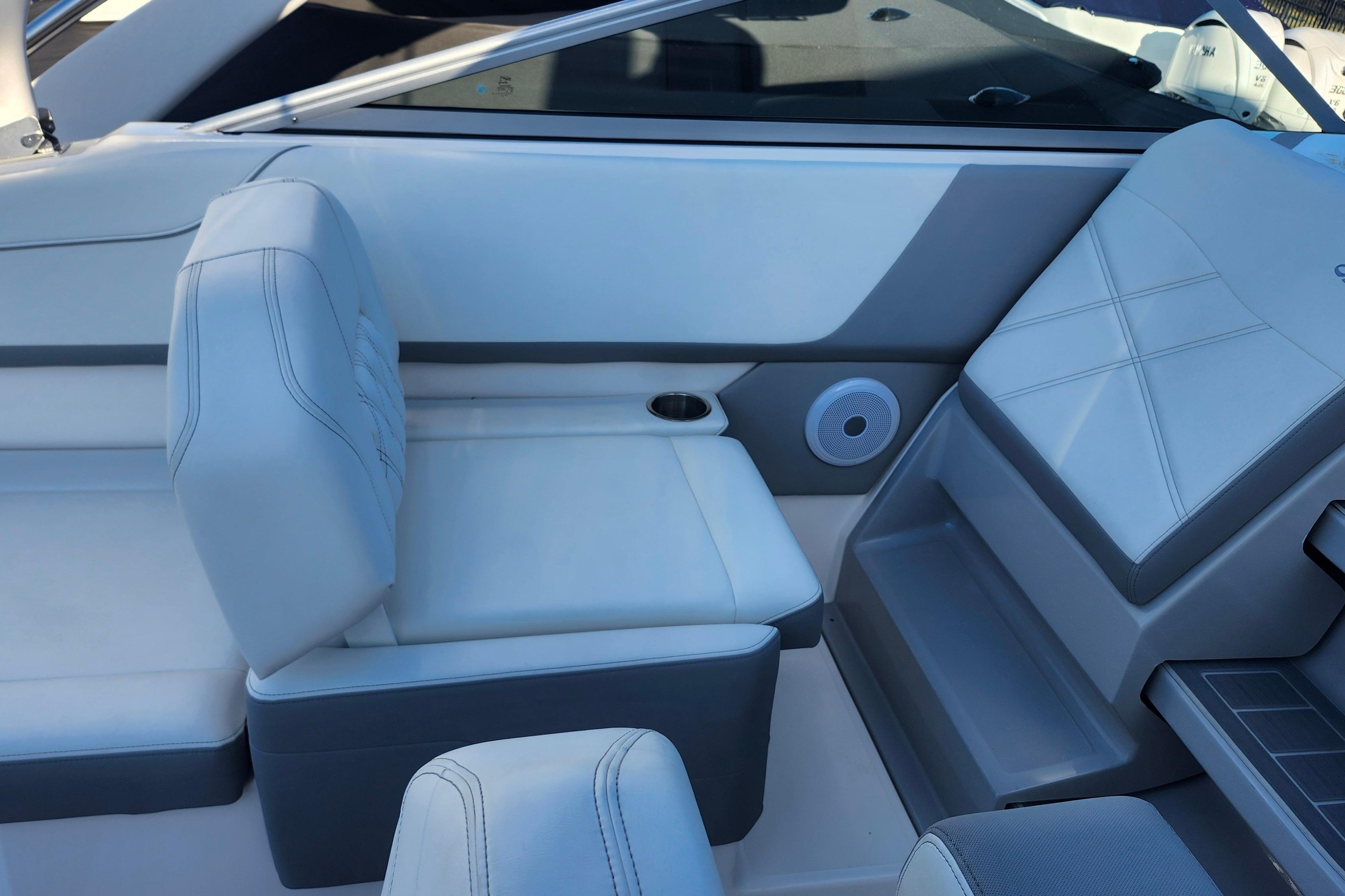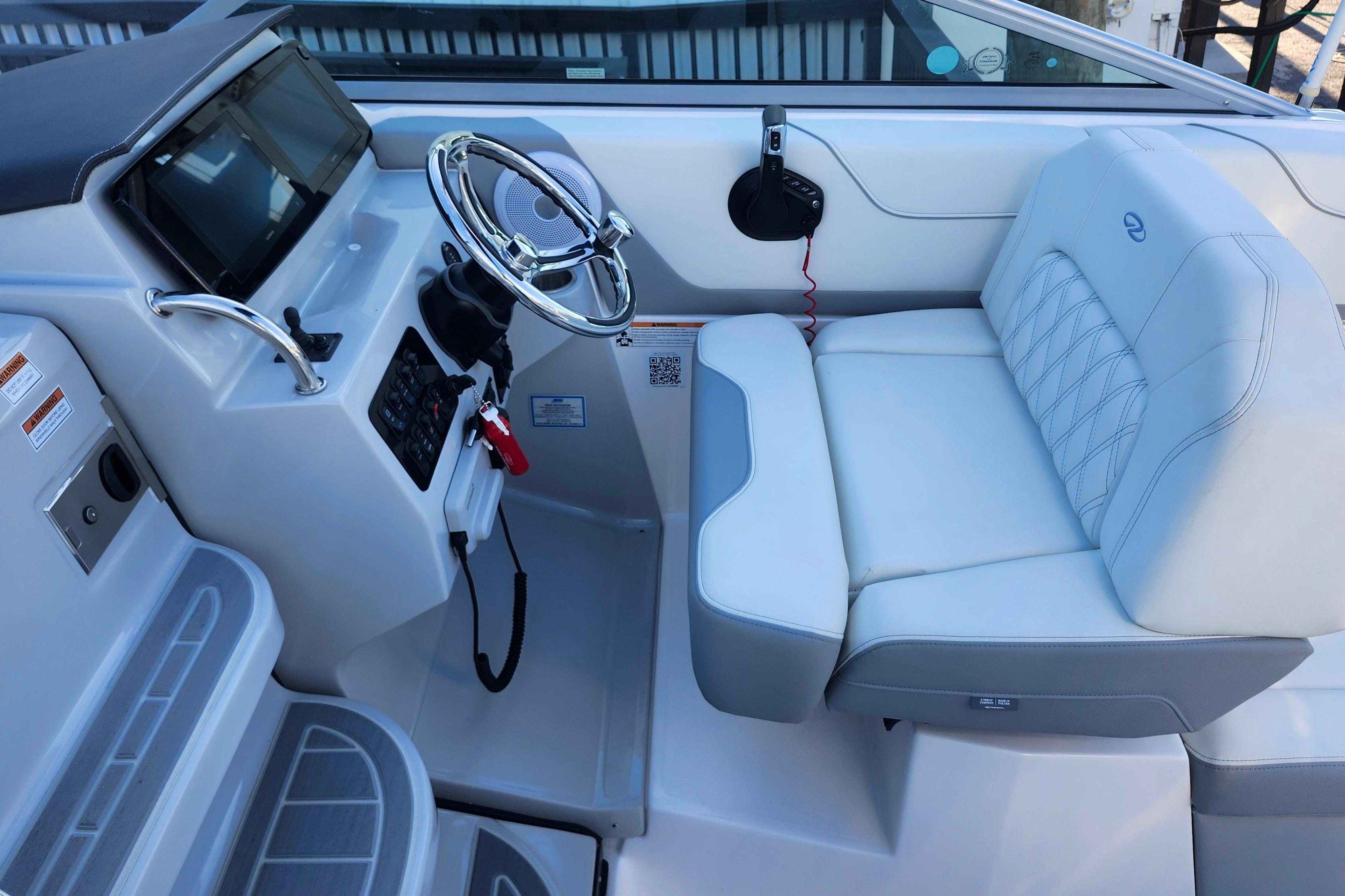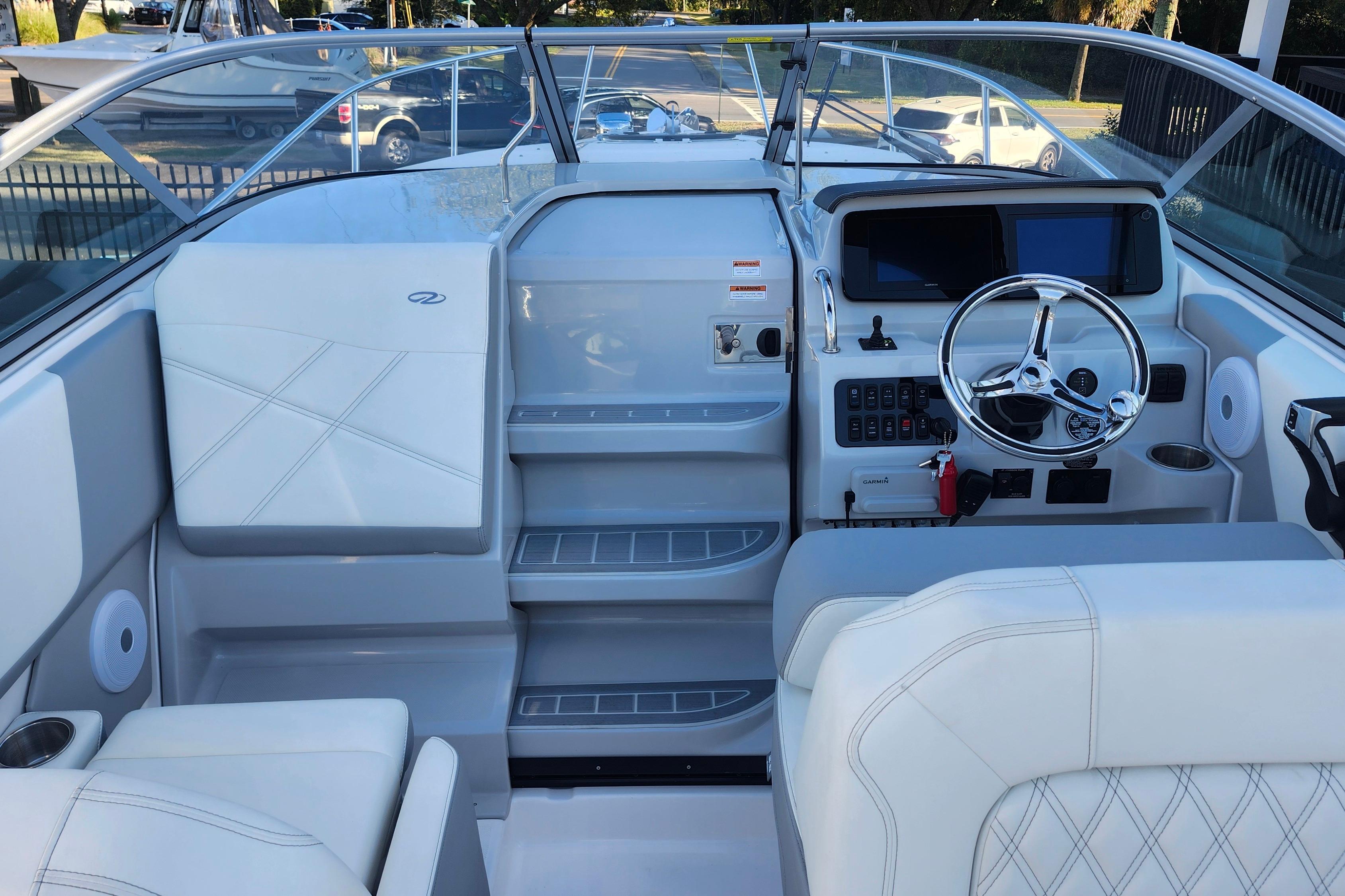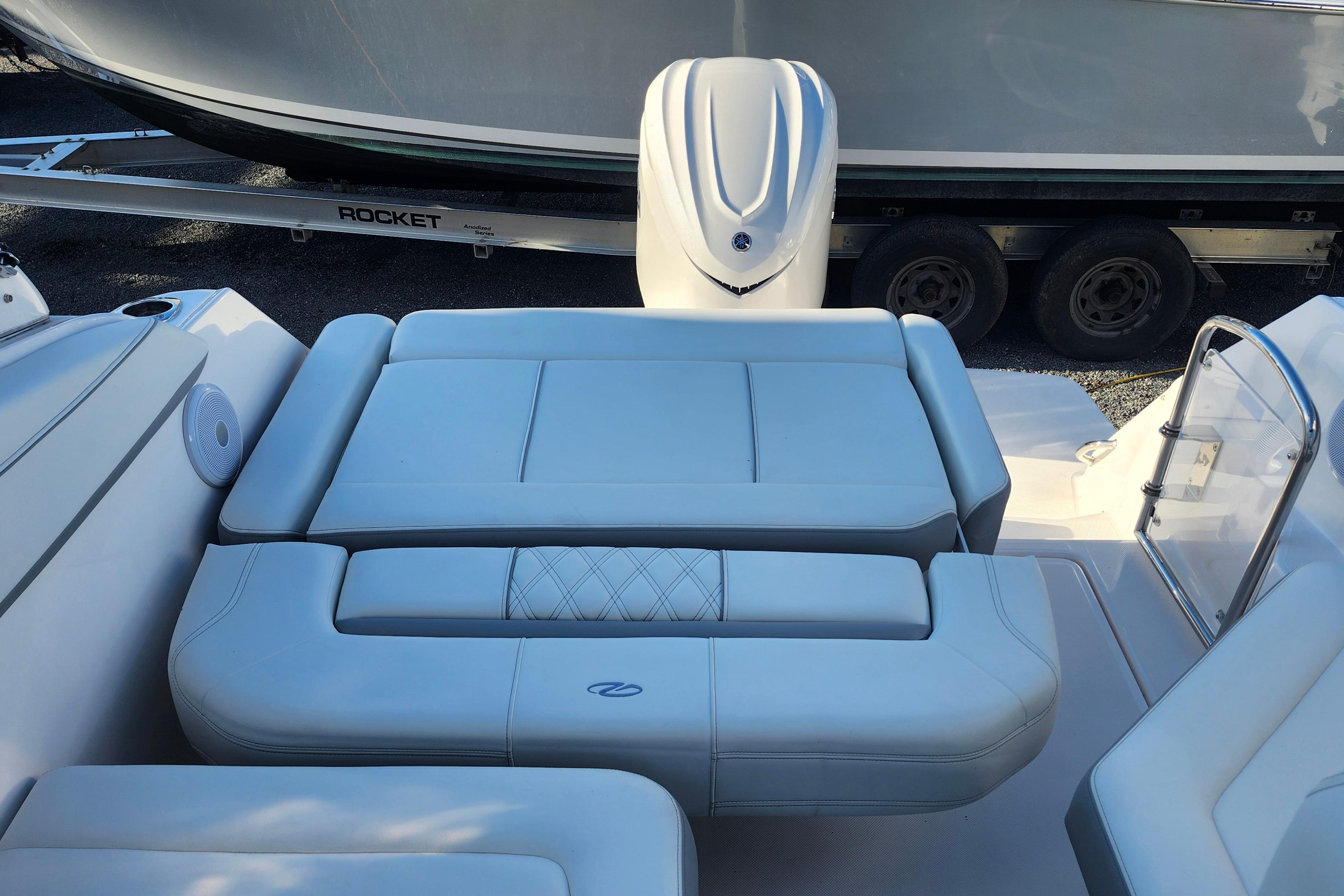Standard features include bow thruster, Fusion Bluetooth stereo, transom shower, trim tabs, refrigerator, dual battery switch, electric steering, dual battery switch and dual Garmin 943xs GPS. Built for ultimate versatility with details crafted to elevate your boating experience, the 26 XO achieves a higher standard of excellence. With ample space and comfort awaiting you in the cockpit, below you will find hospitable amenities and accommodations designed to keep you and your guests refreshed and relaxed all day long.