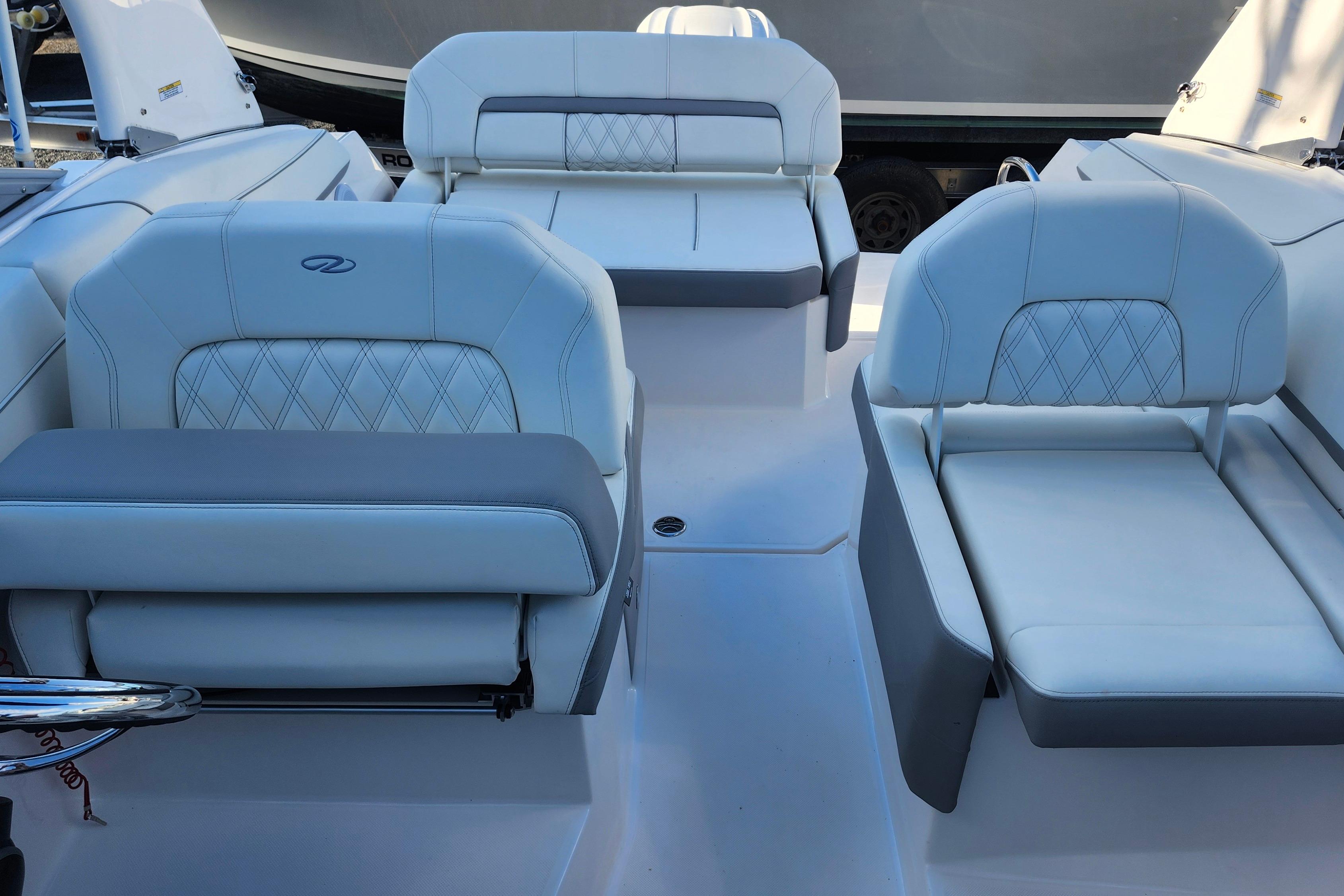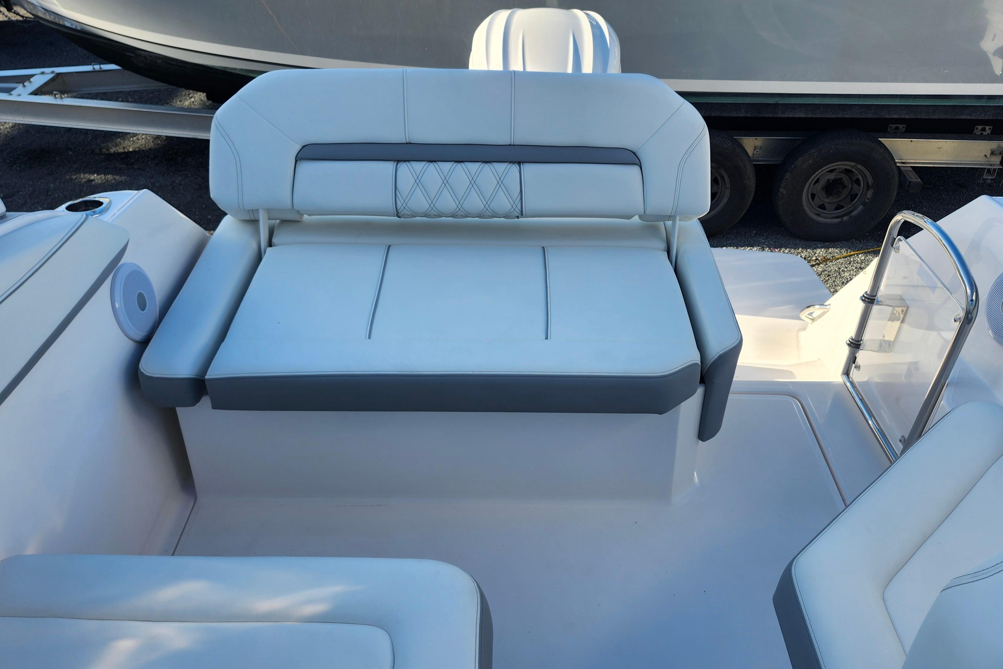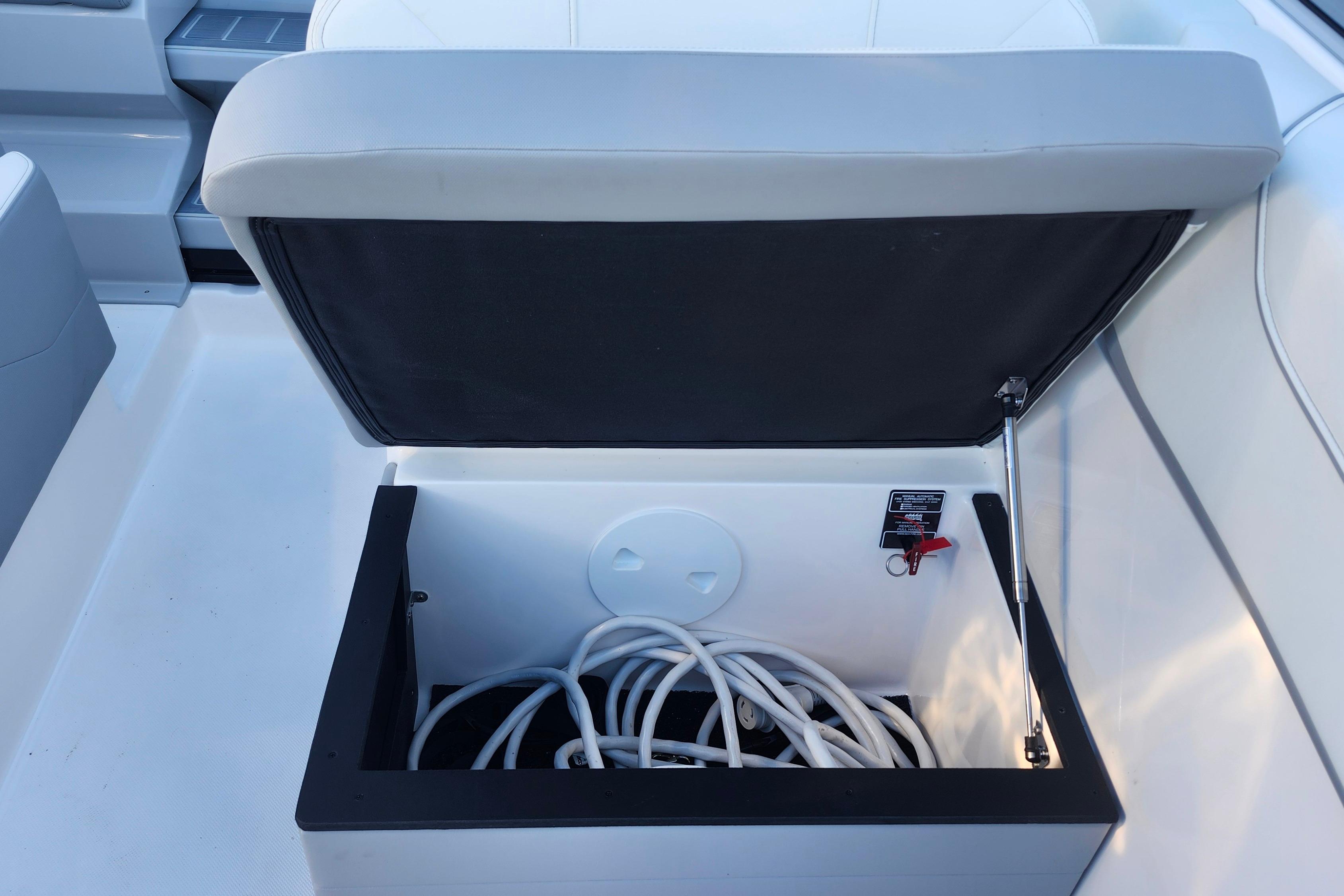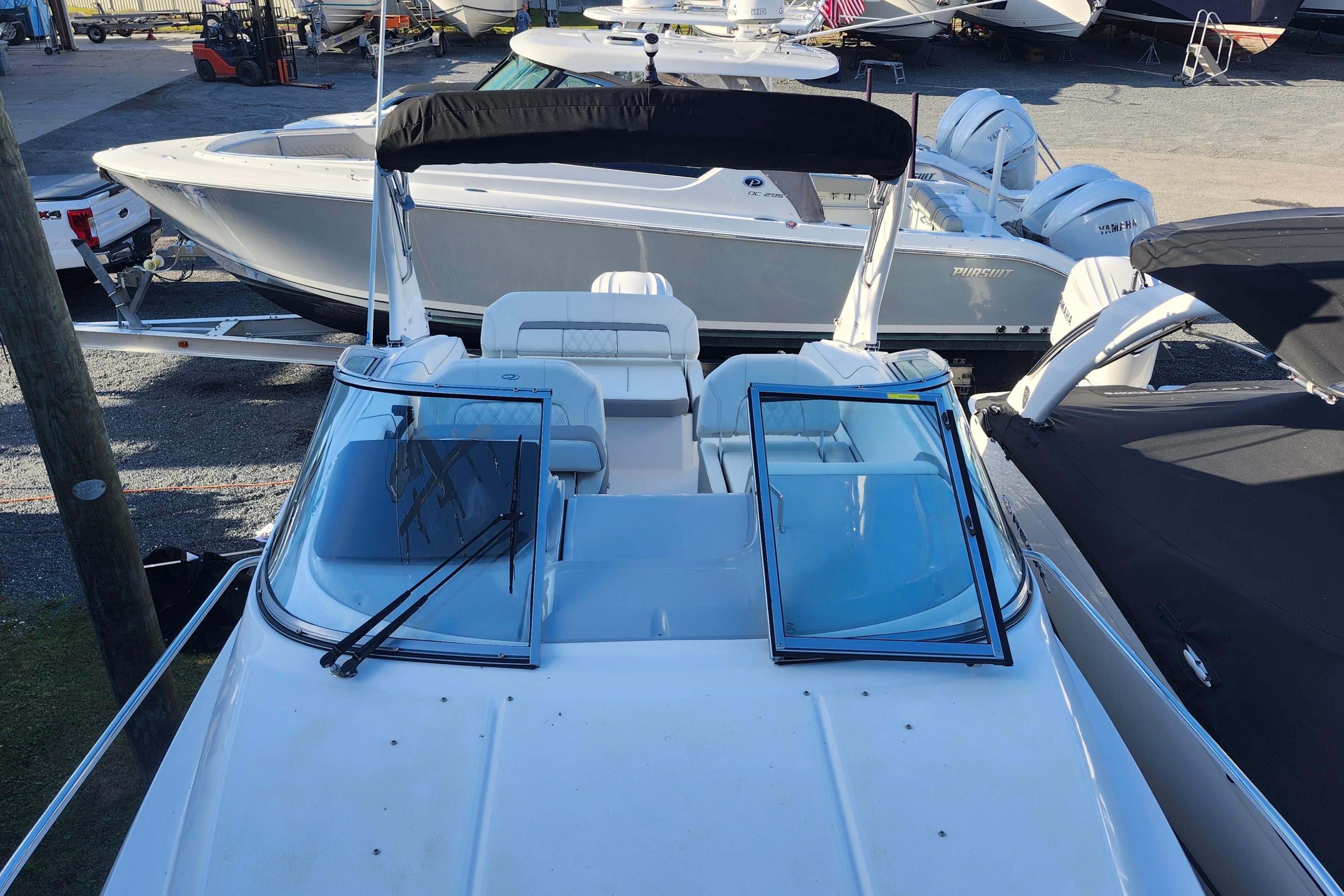 Standard features include bow thruster, Fusion Bluetooth stereo, transom shower, trim tabs, refrigerator, dual battery switch, electric steering, dual battery switch and dual Garmin 943xs GPS. Built for ultimate versatility with details crafted to elevate your boating experience, the 26 XO achieves a higher standard of excellence. With ample space and comfort awaiting you in the cockpit, below you will find hospitable amenities and accommodations designed to keep you and your guests refreshed and relaxed all day long.