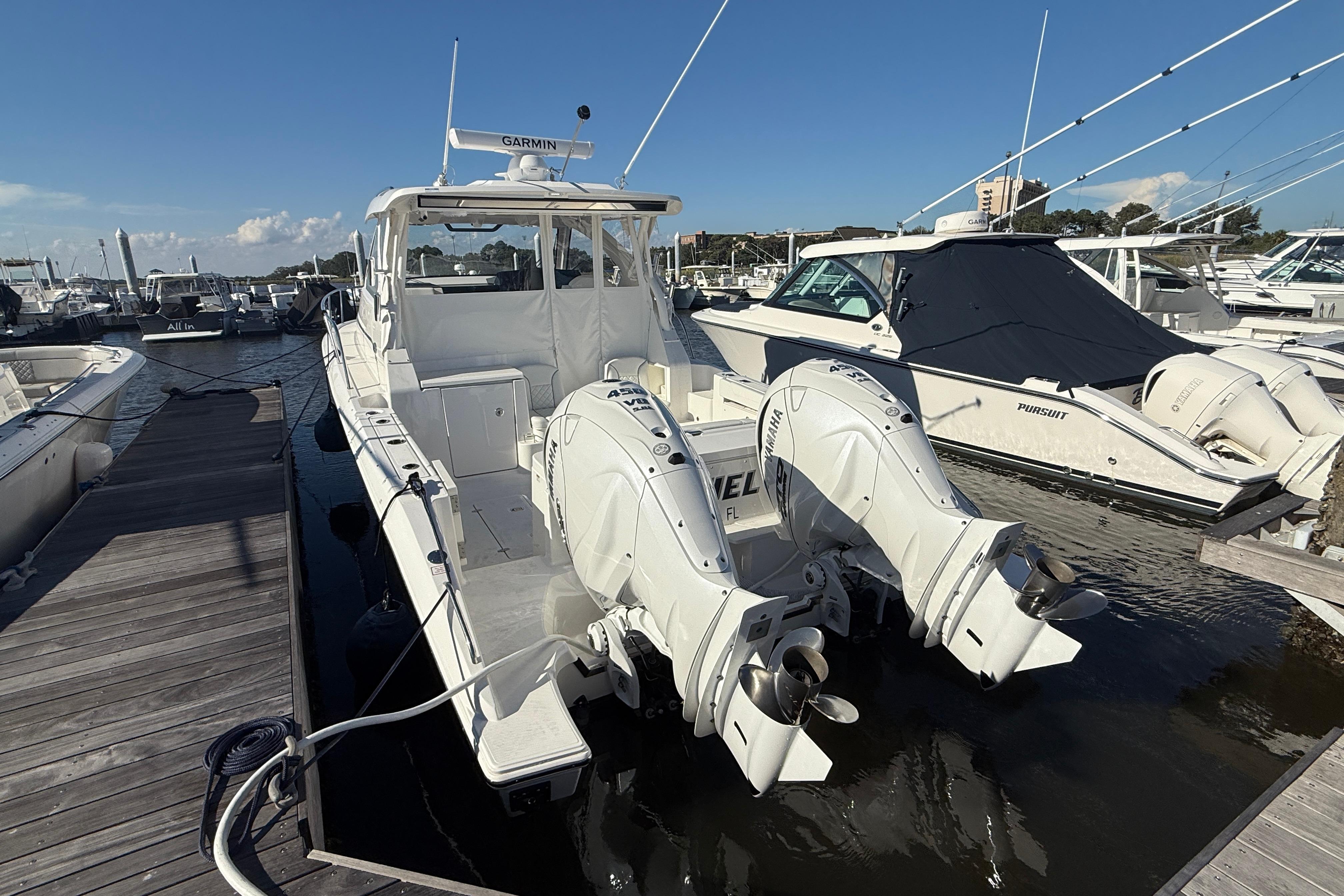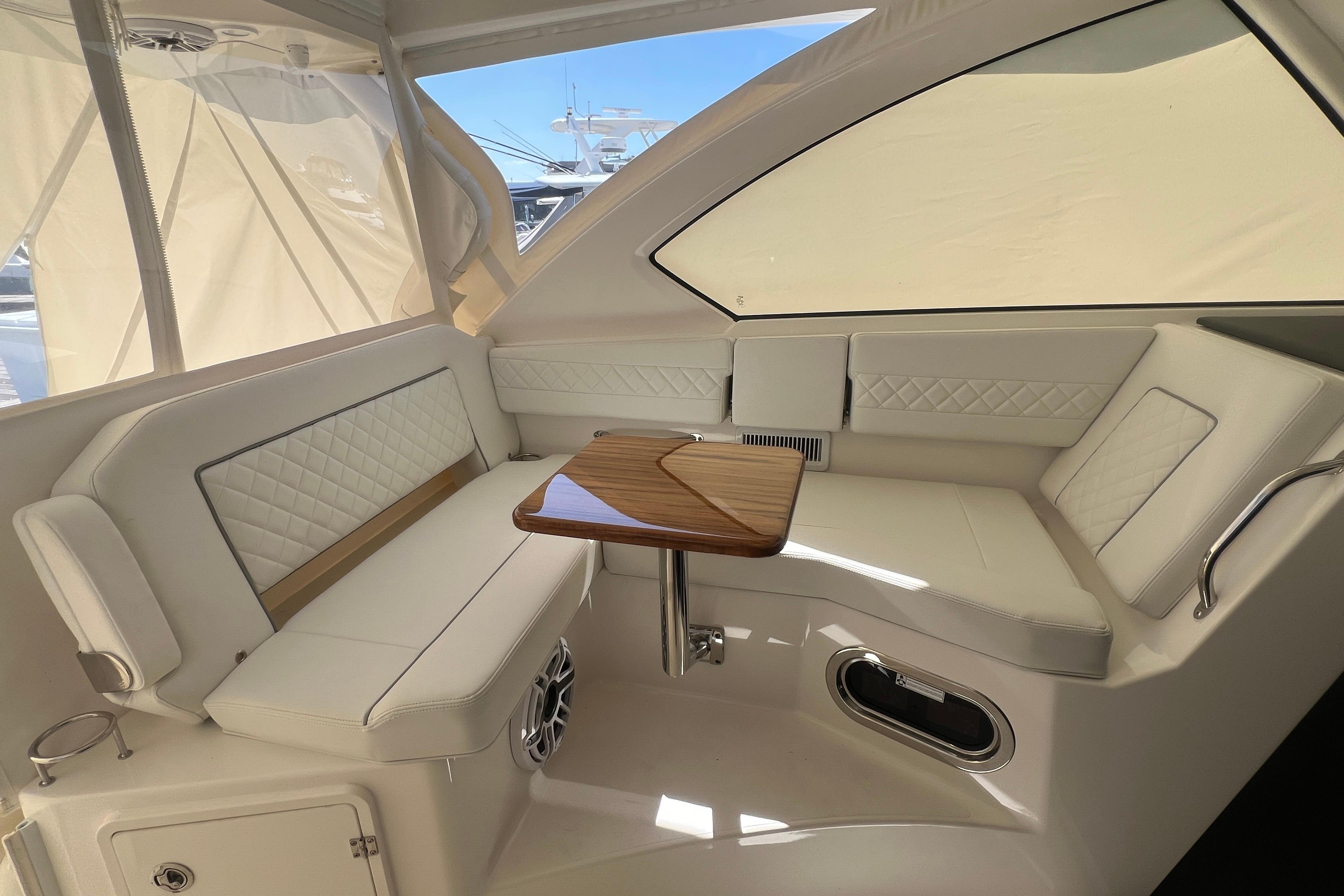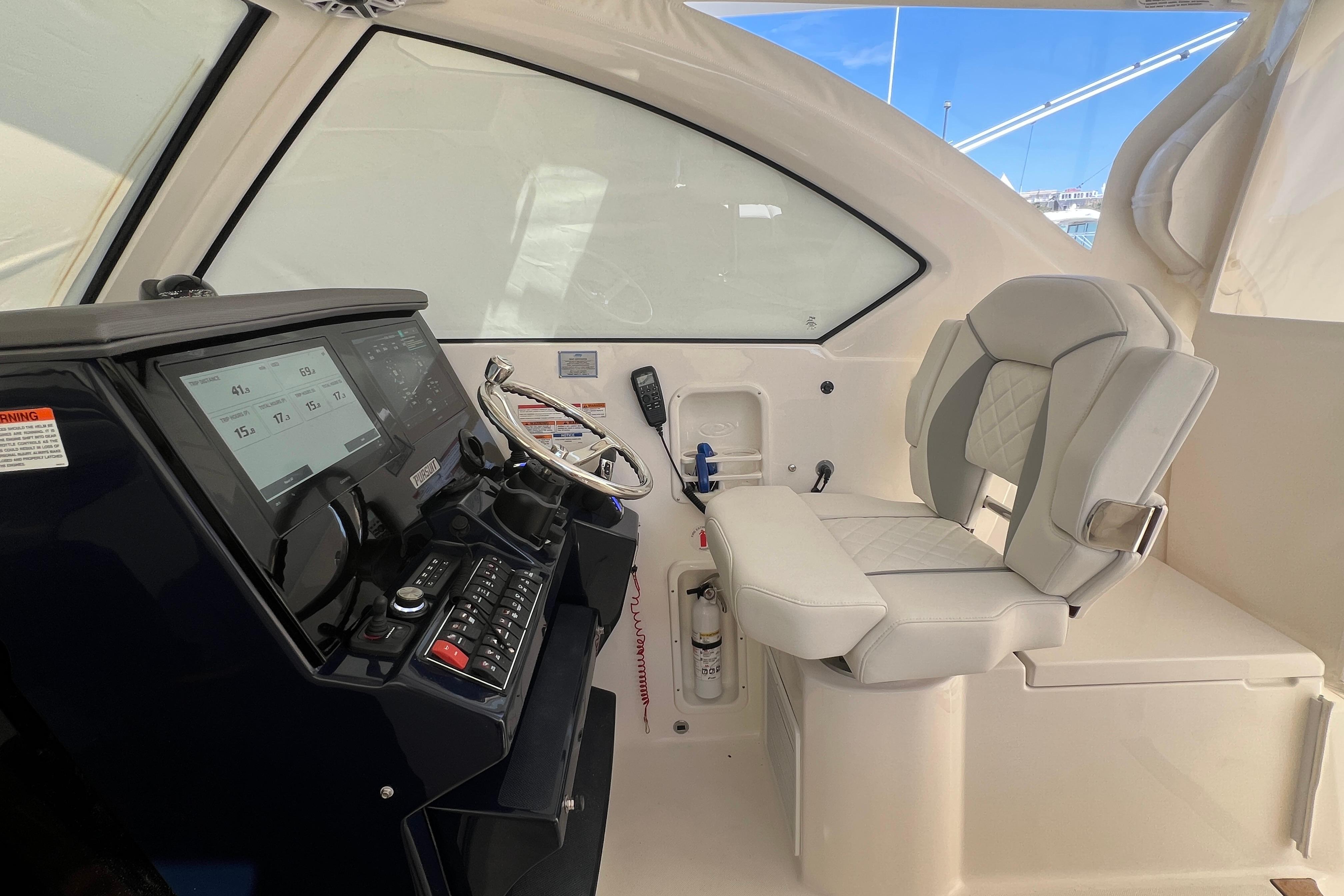 The OS 355 encompasses the winning formula you’ve come to expect from Pursuit. A single-piece optically clear windshield, updated exterior fabrics and finishes with innovative seating arrangements, give you every reason to dive into a brand new offshore. The increased natural light throughout the stylish hull-side windows, stainless steel refrigerator and electrically actuated convertible berth/ dinette are a few of the cabin features that punctuate this model with yacht caliber appointments.