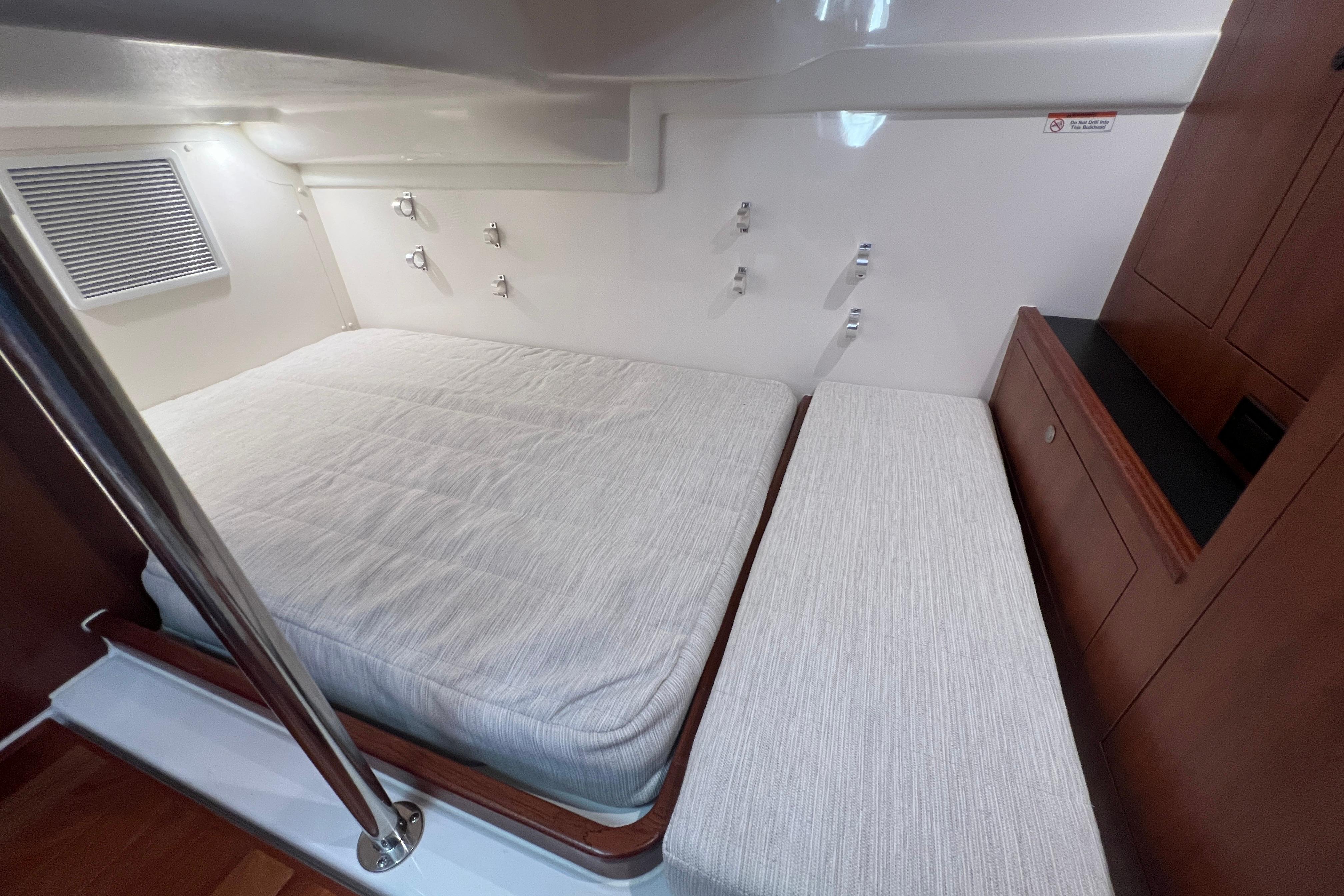 • Electrically Actuated Custom V-Berth Seating with Fixed Cushions that Converts into Queen Size Berth
