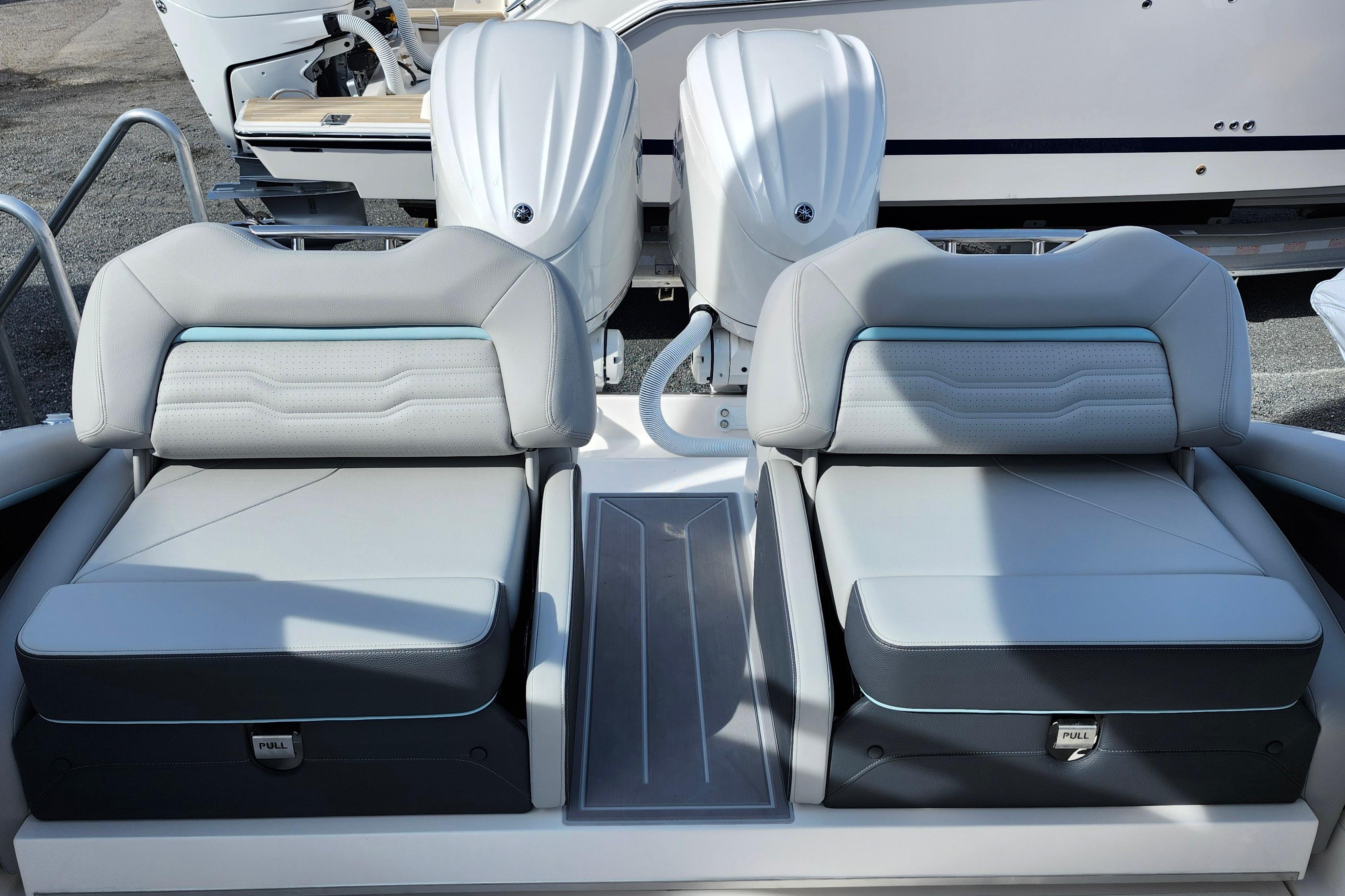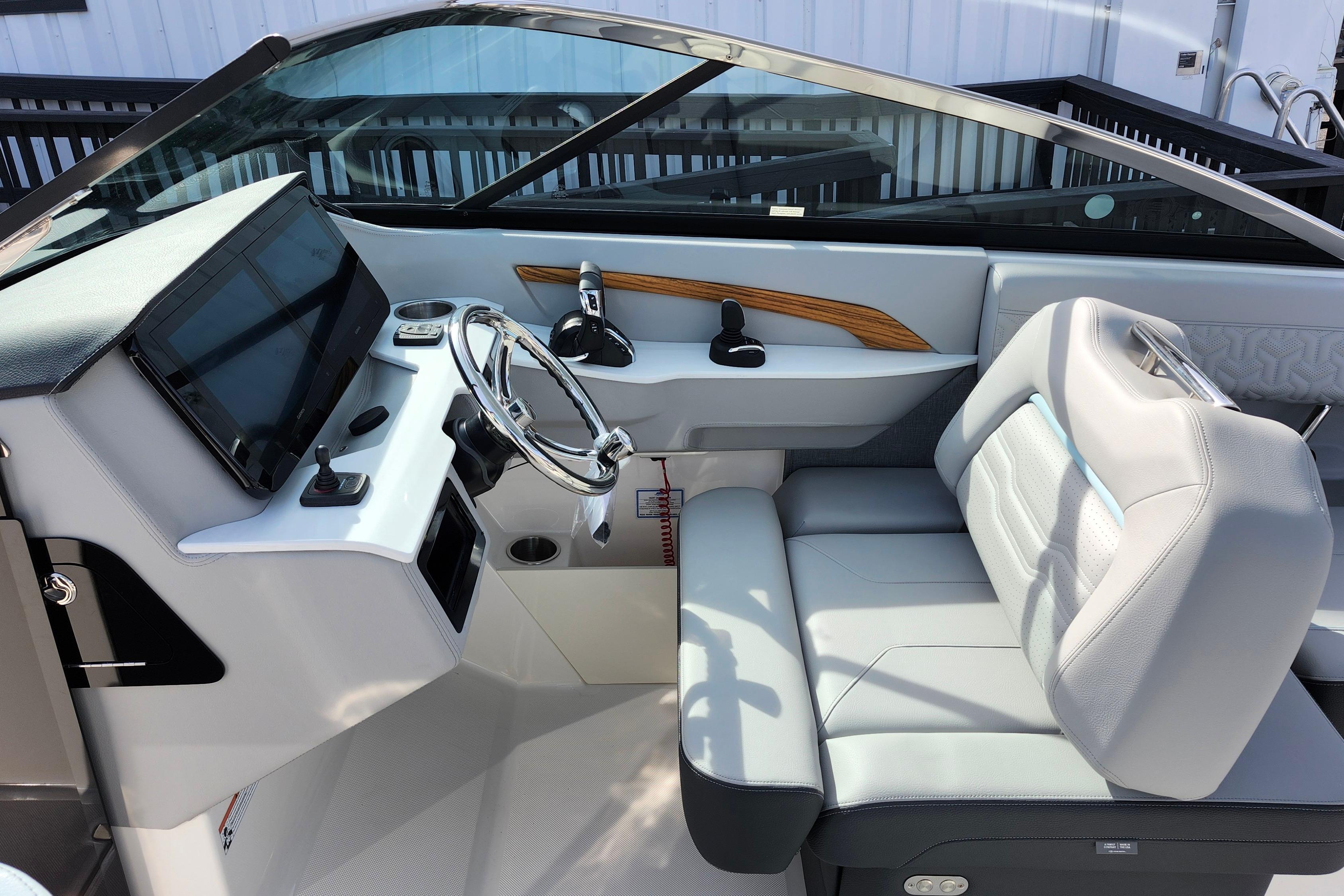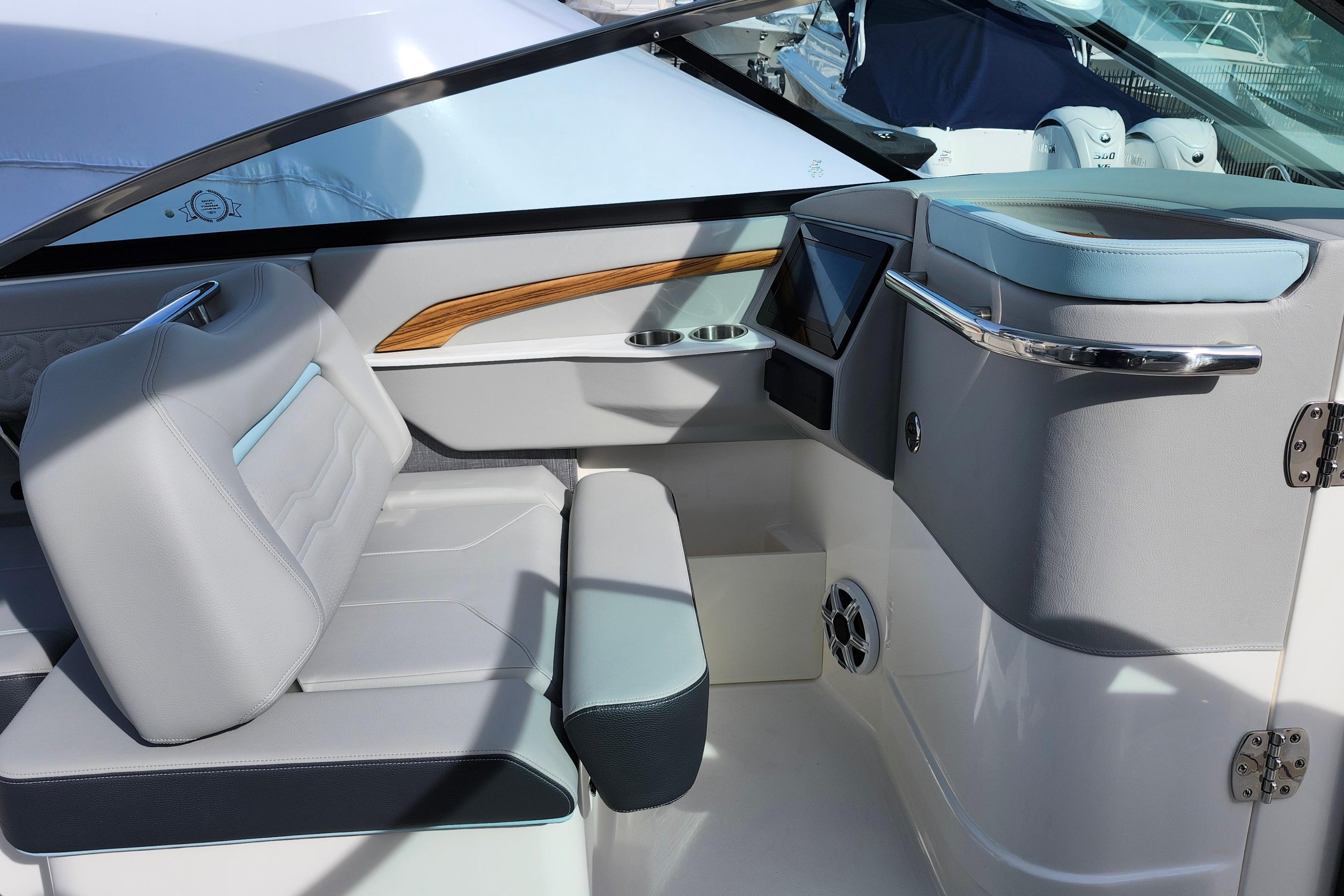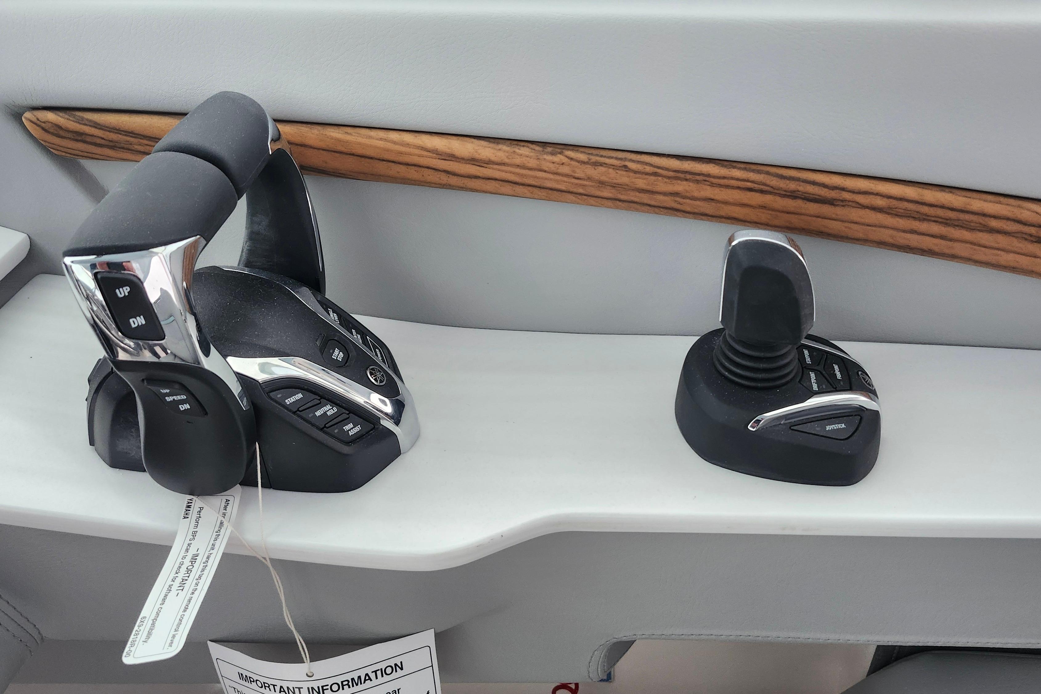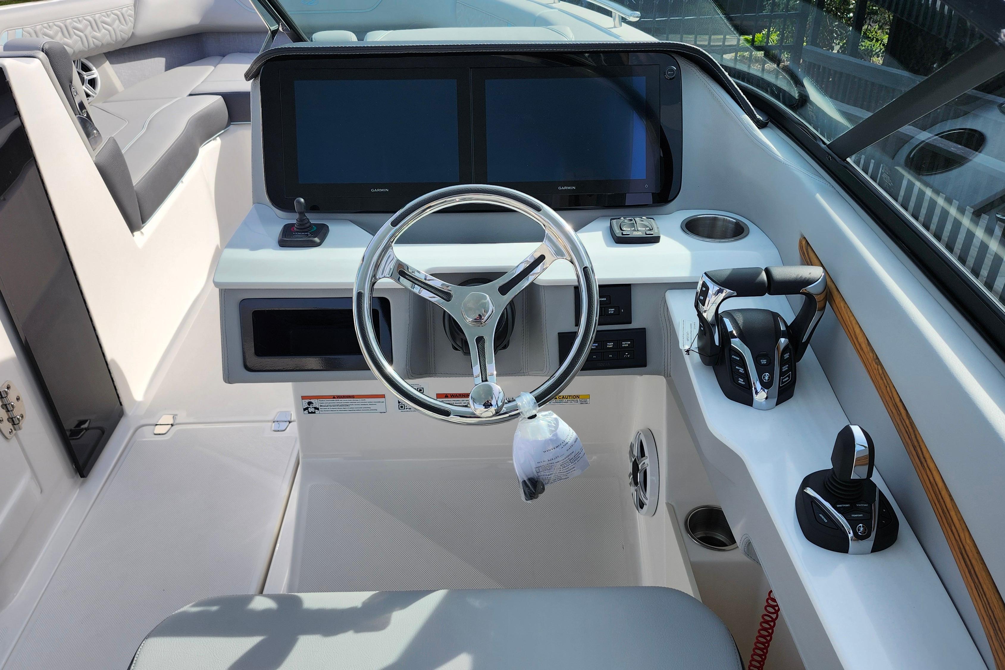 Some of the popular standard features include custom interior with belle isle blue accents, Yamaha Helm Master with Joystick, digital switching, bow thruster, transom shower, bow walk-thru doors, stereo performance and lighting package, dual Garmin 1243XSV with B60 transducer and stainless steel flag pole.