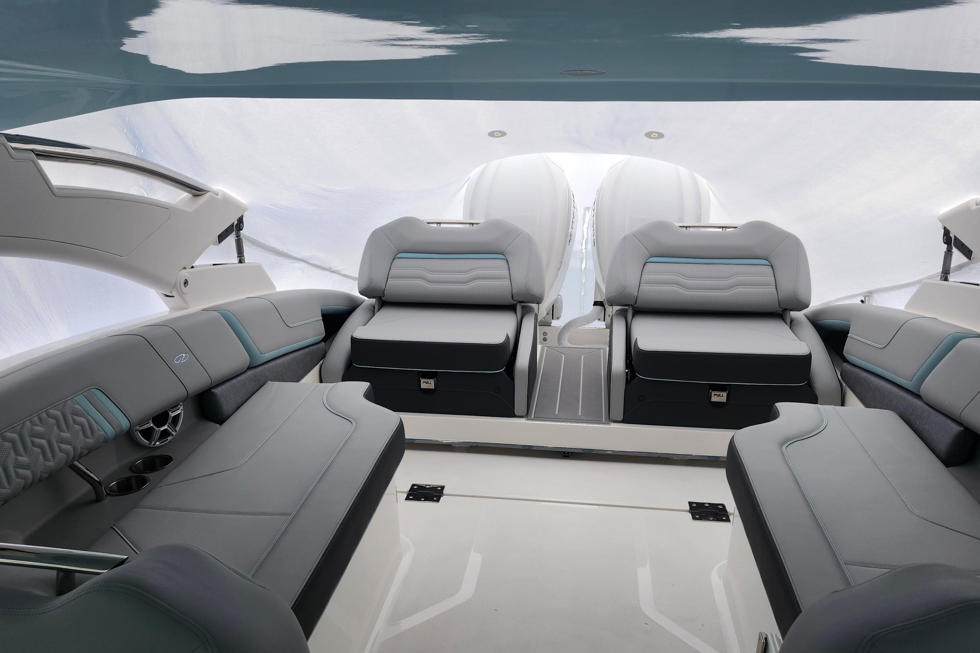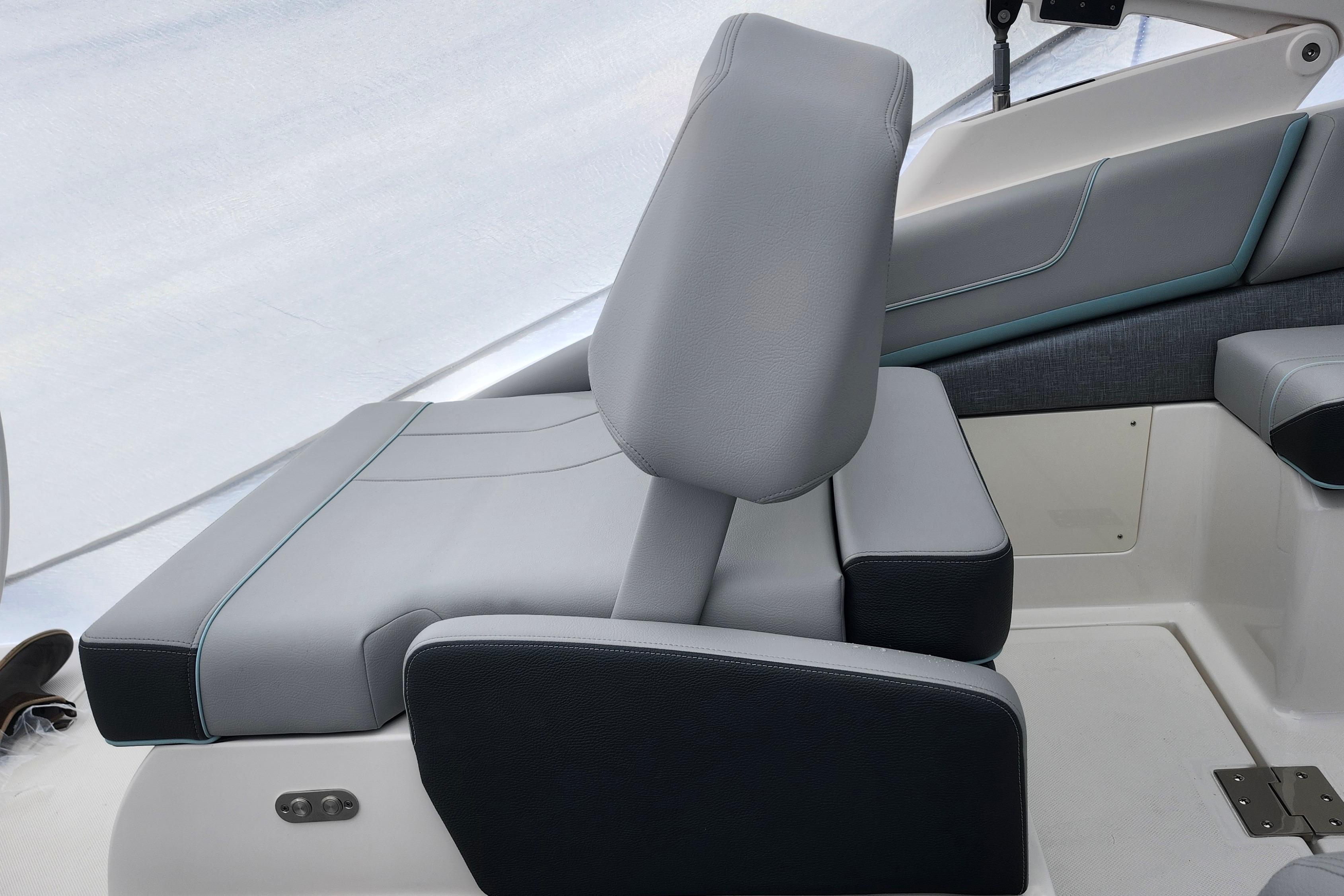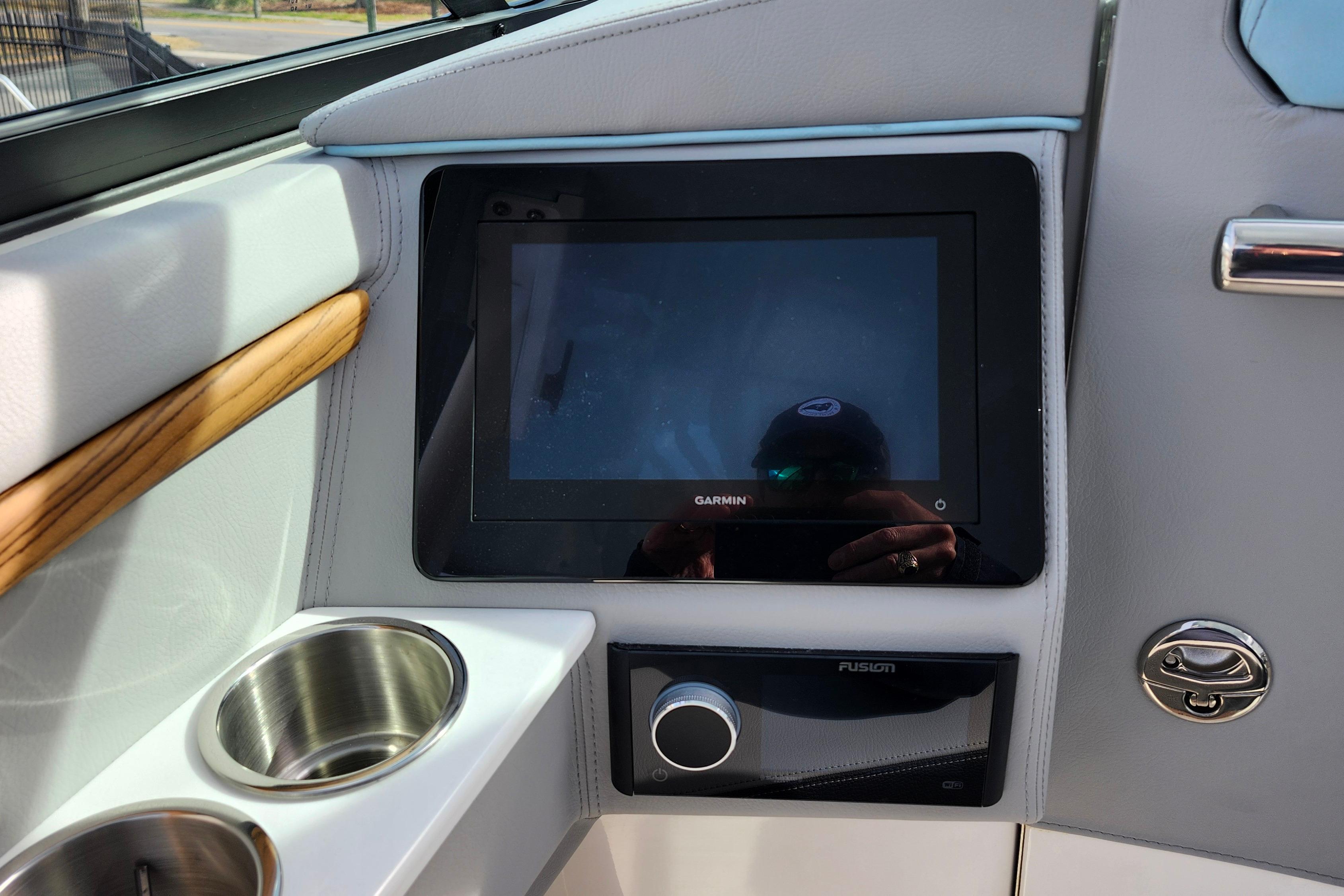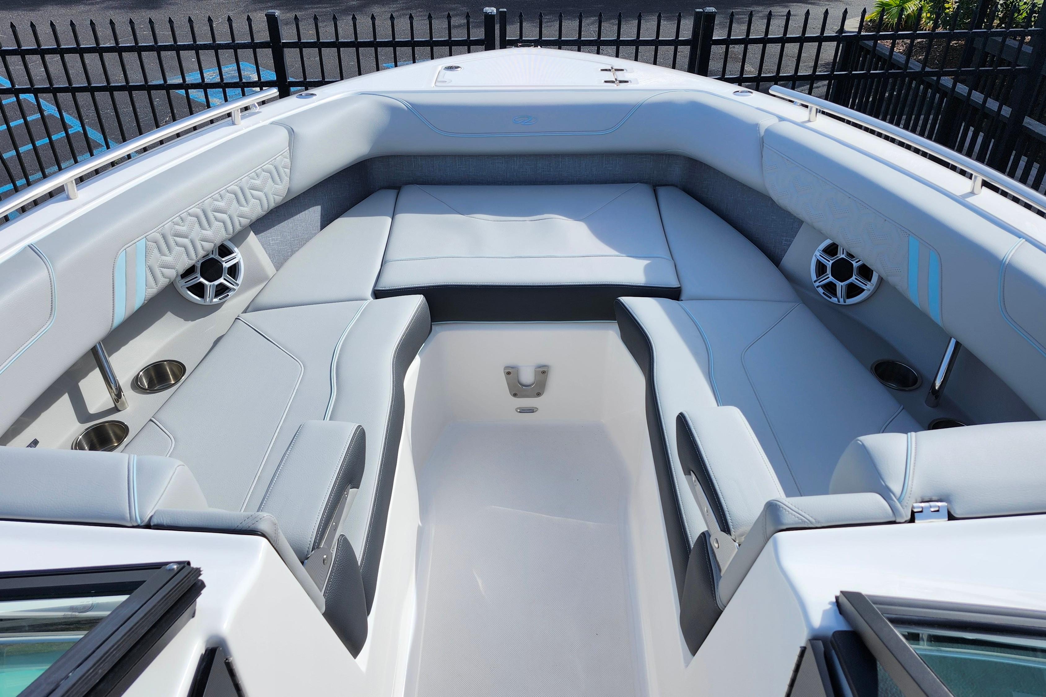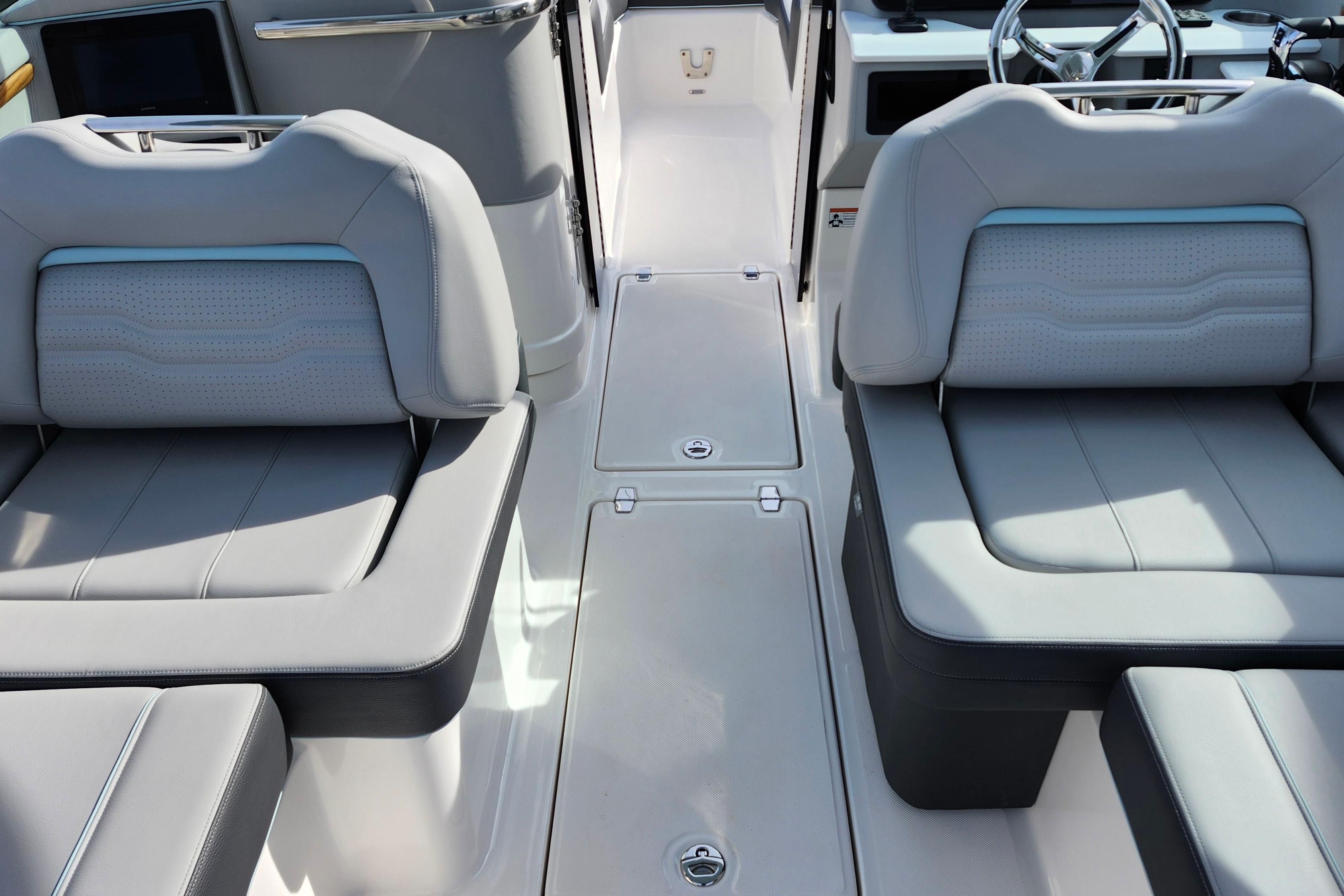 Some of the popular standard features include custom interior with belle isle blue accents, Yamaha Helm Master with Joystick, digital switching, bow thruster, transom shower, bow walk-thru doors, stereo performance and lighting package, dual Garmin 1243XSV with B60 transducer and stainless steel flag pole.