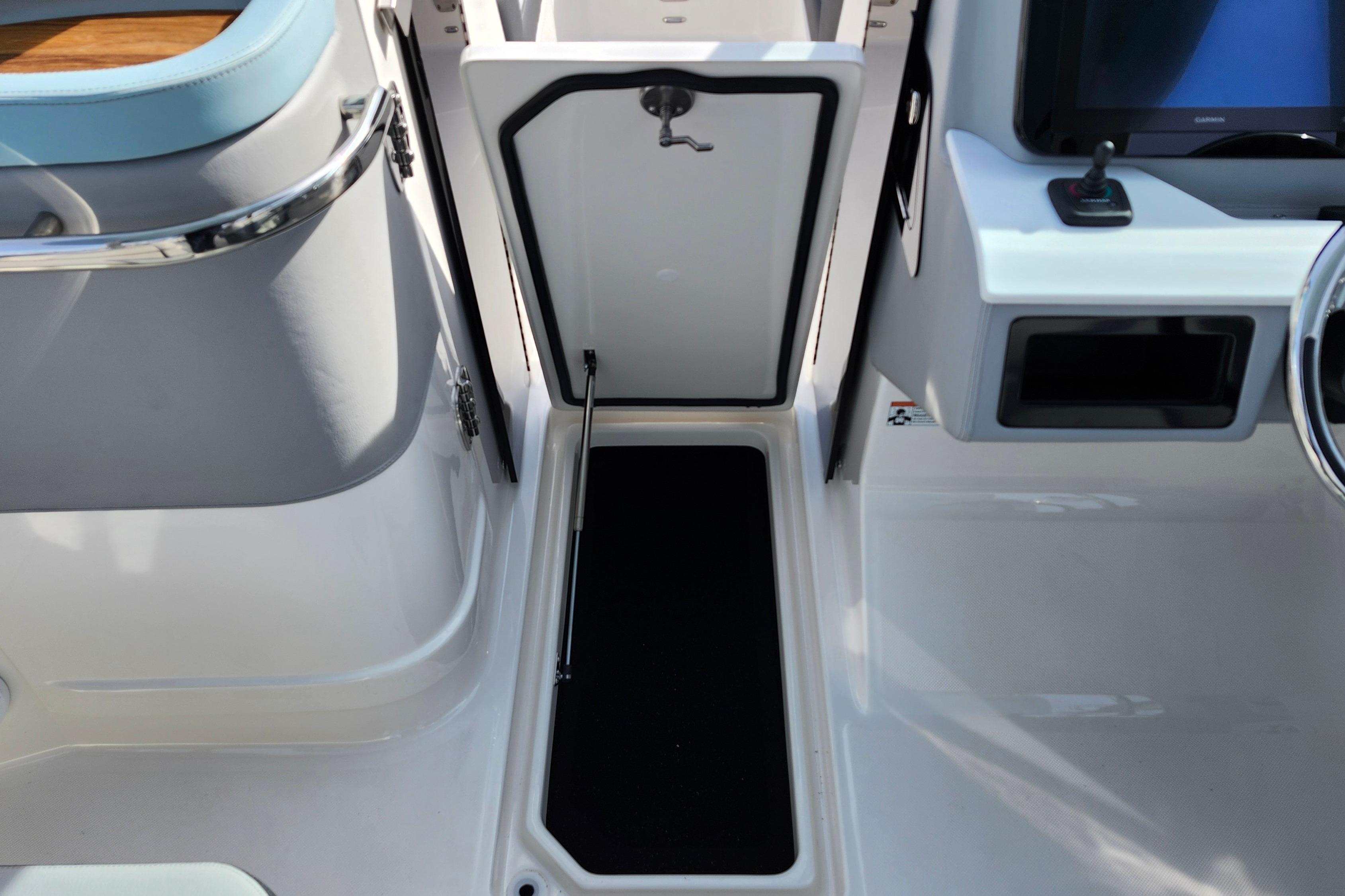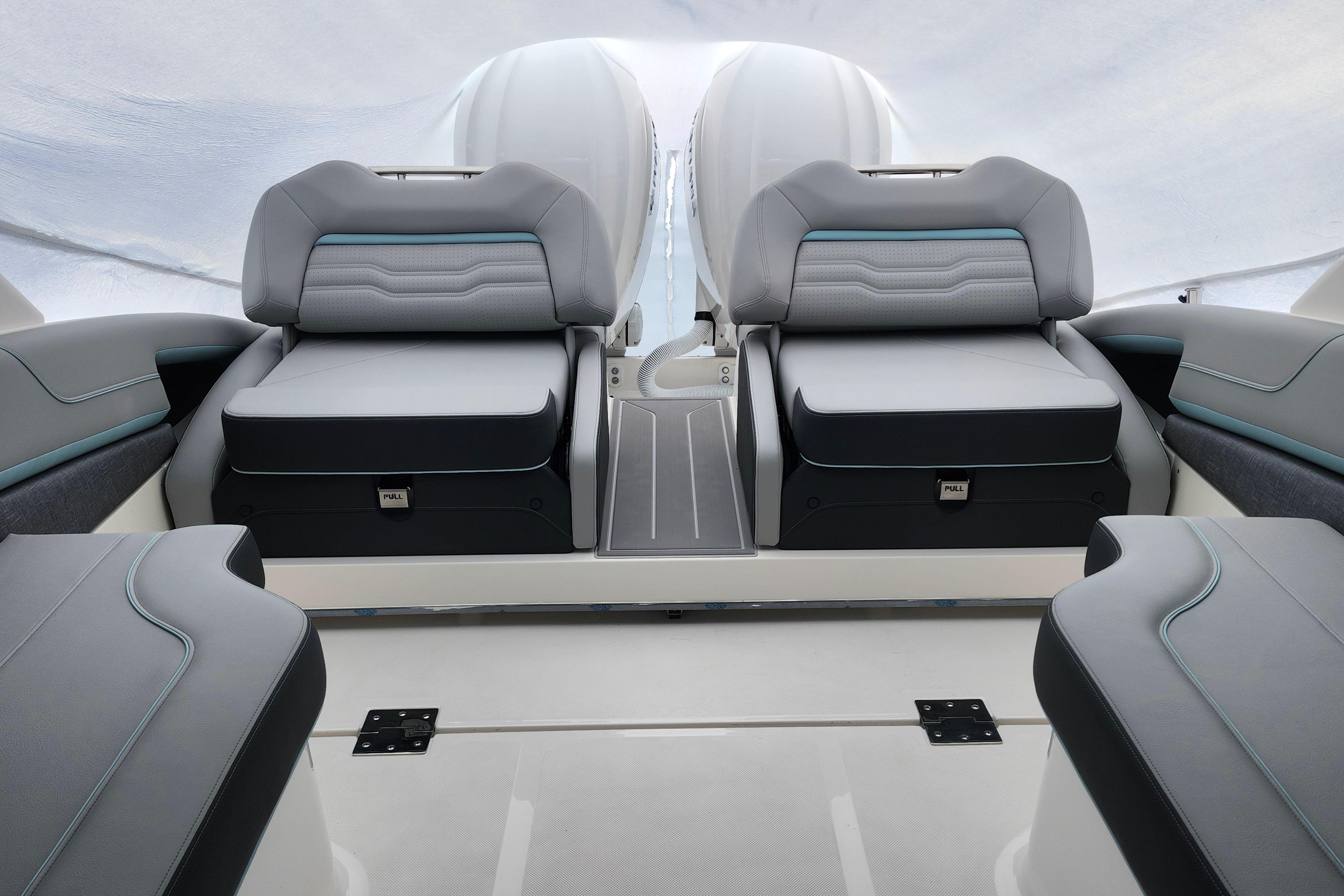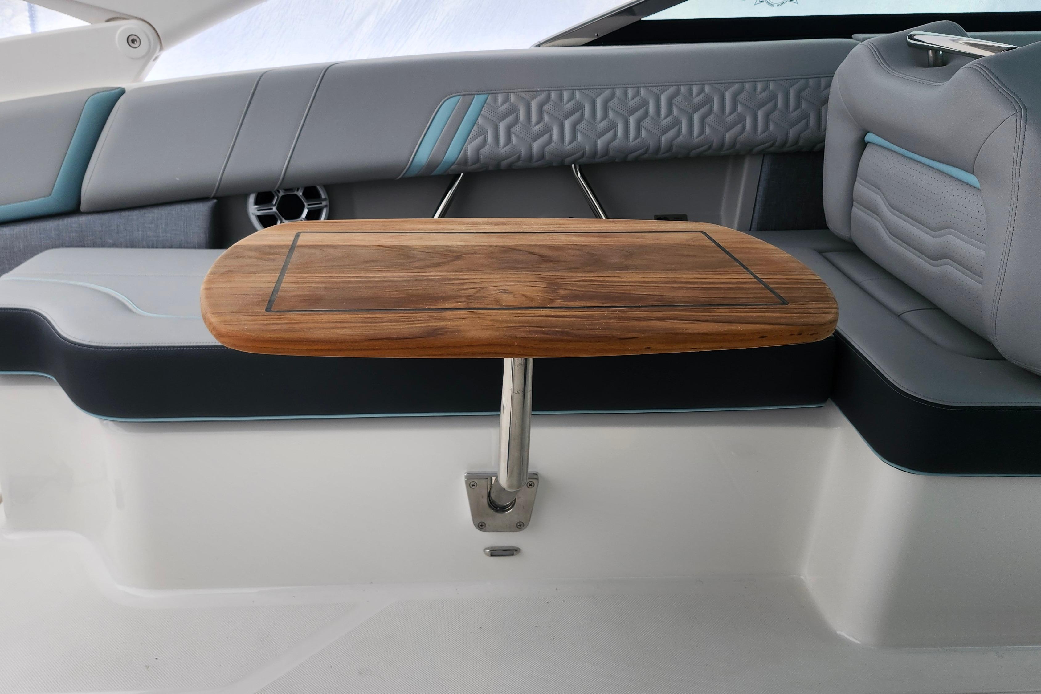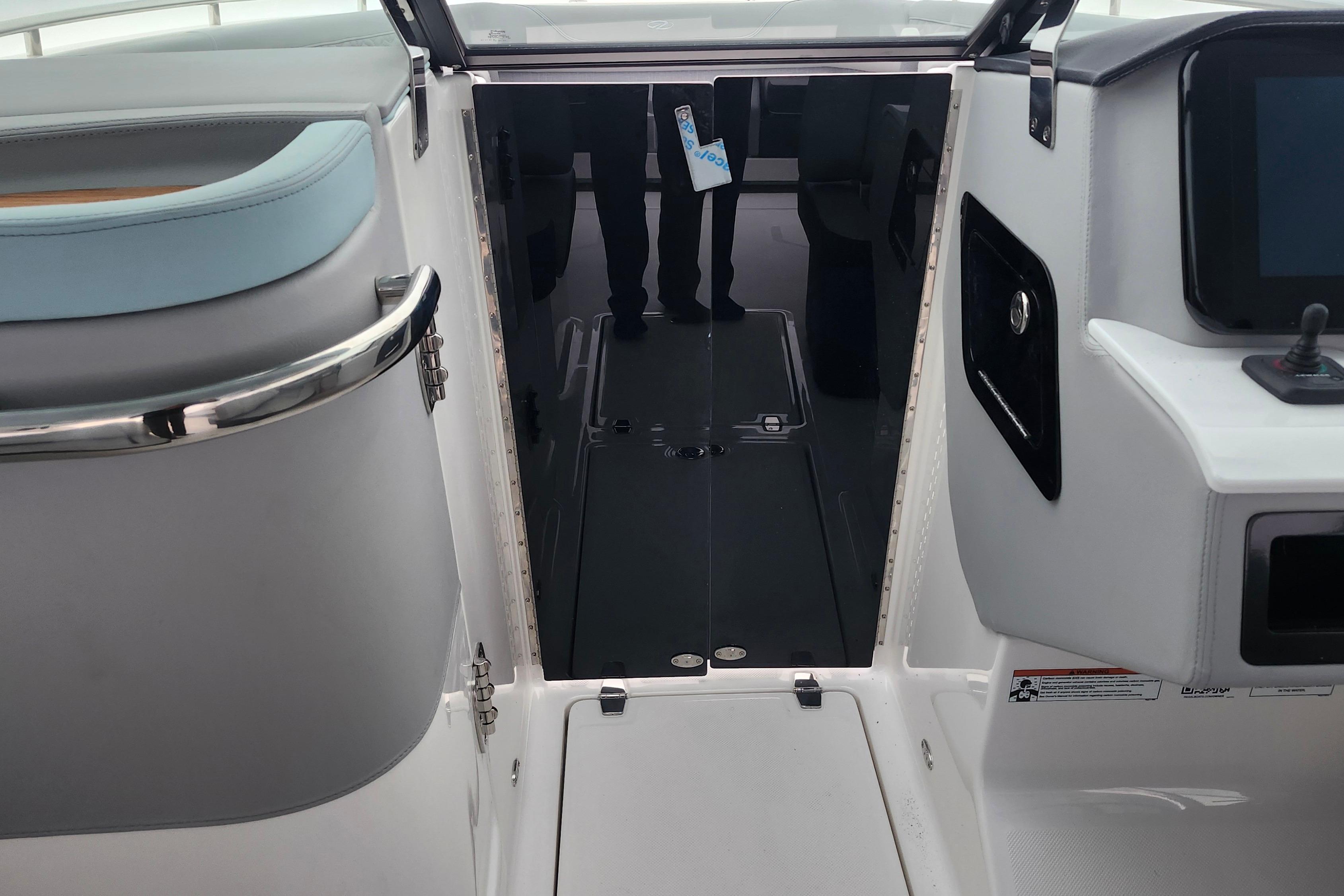 Some of the popular standard features include custom interior with belle isle blue accents, Yamaha Helm Master with Joystick, digital switching, bow thruster, transom shower, bow walk-thru doors, stereo performance and lighting package, dual Garmin 1243XSV with B60 transducer and stainless steel flag pole.