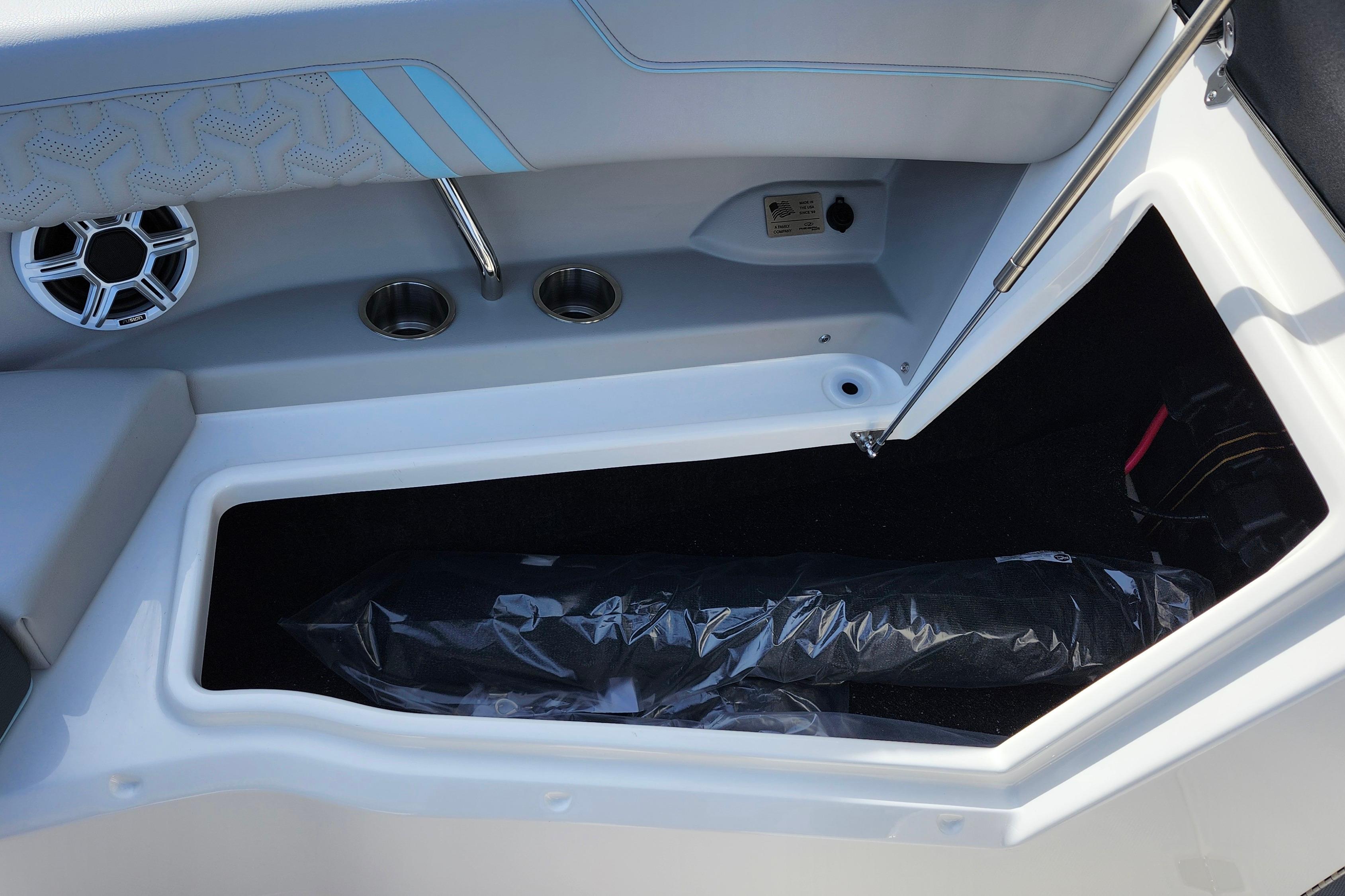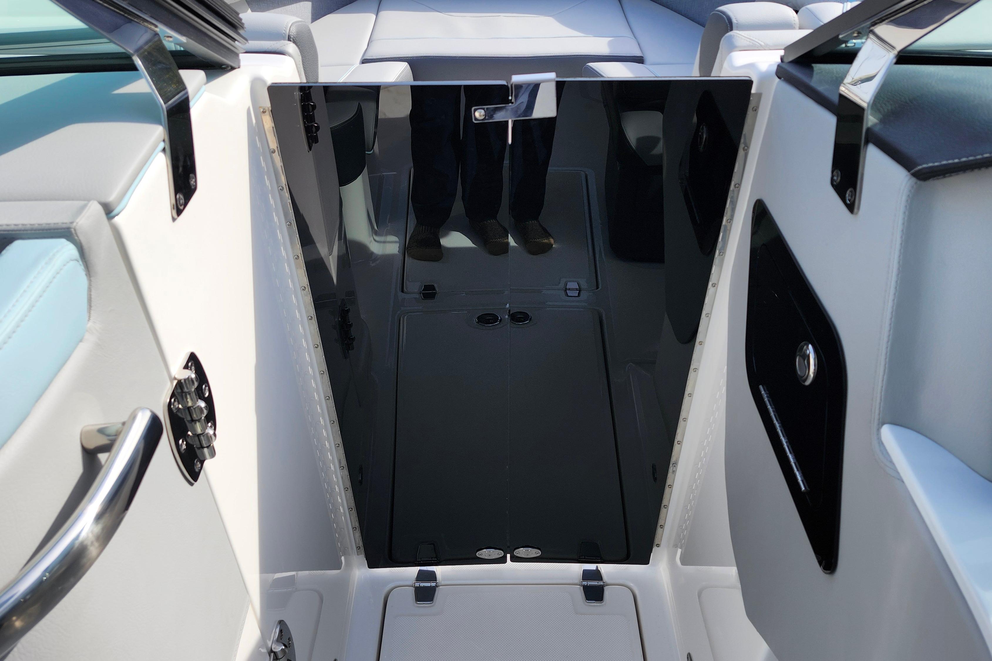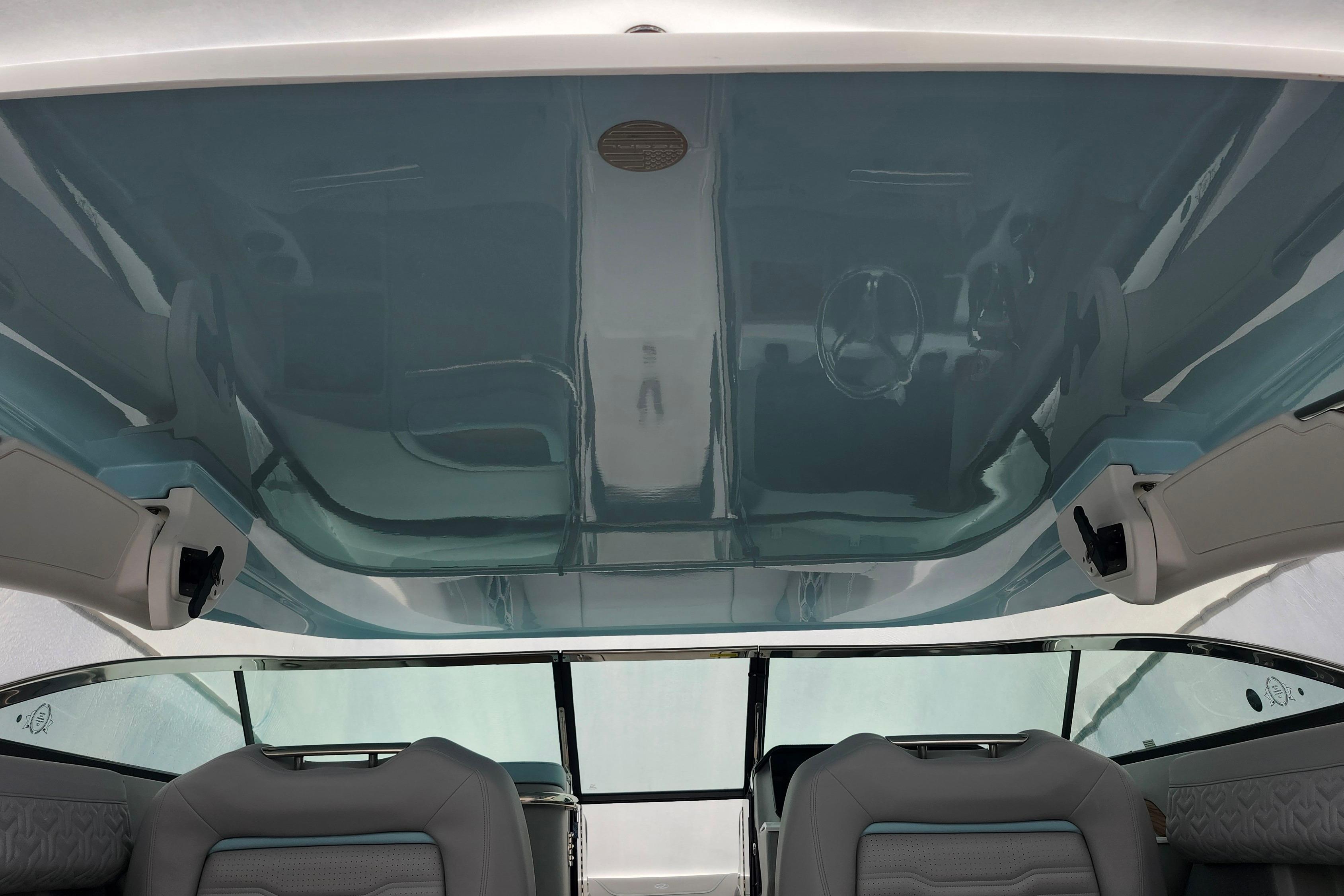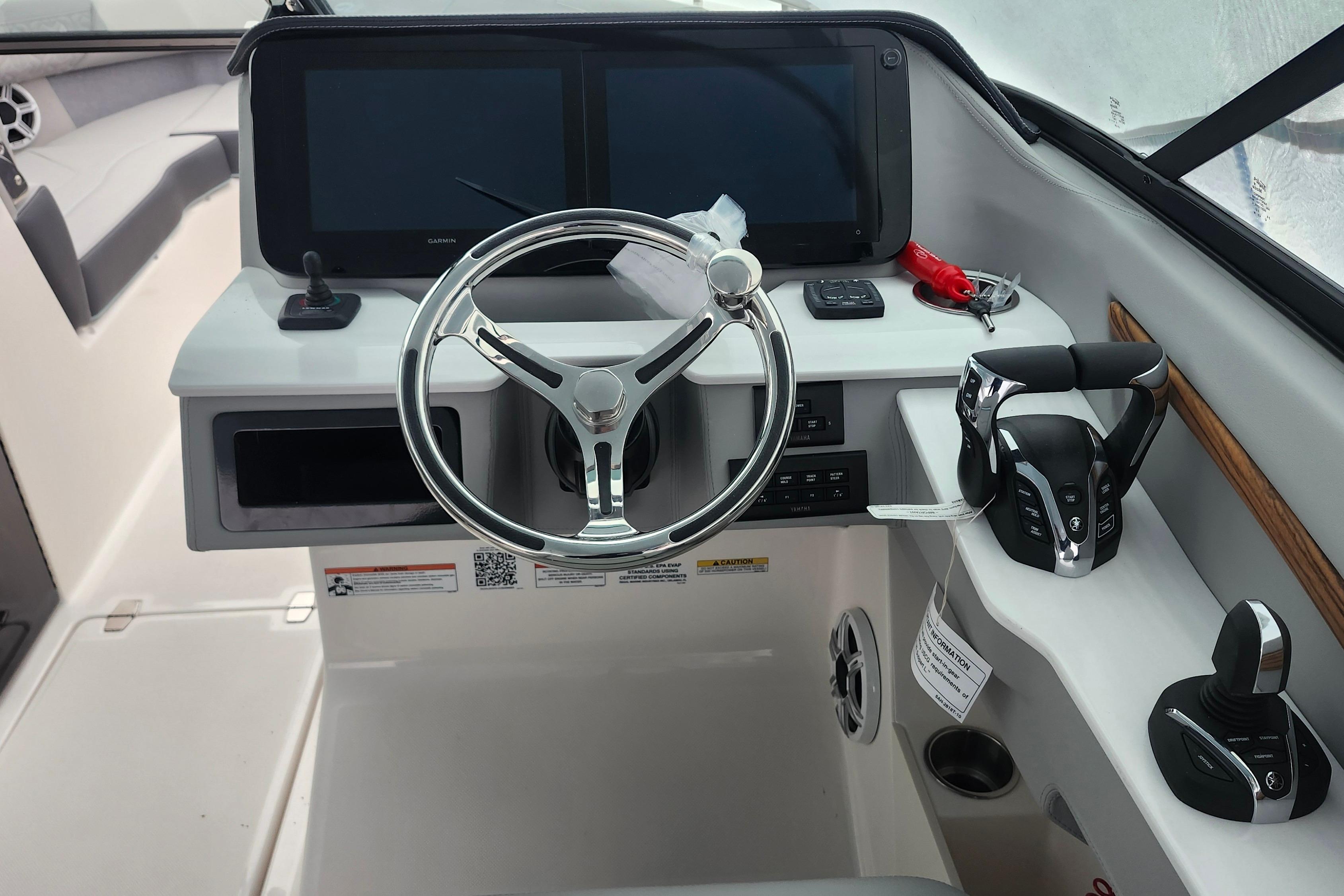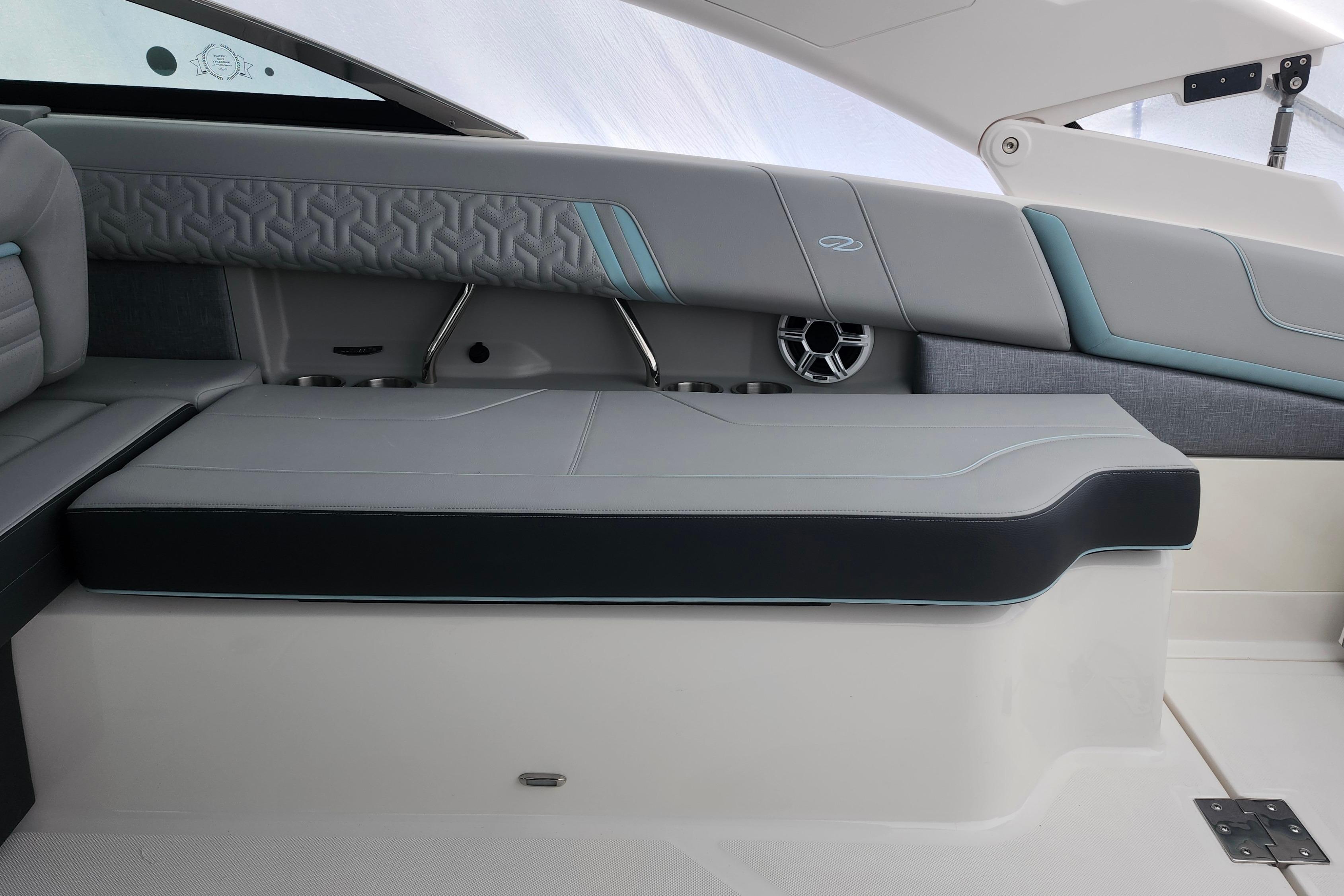 Some of the popular standard features include custom interior with belle isle blue accents, Yamaha Helm Master with Joystick, digital switching, bow thruster, transom shower, bow walk-thru doors, stereo performance and lighting package, dual Garmin 1243XSV with B60 transducer and stainless steel flag pole.