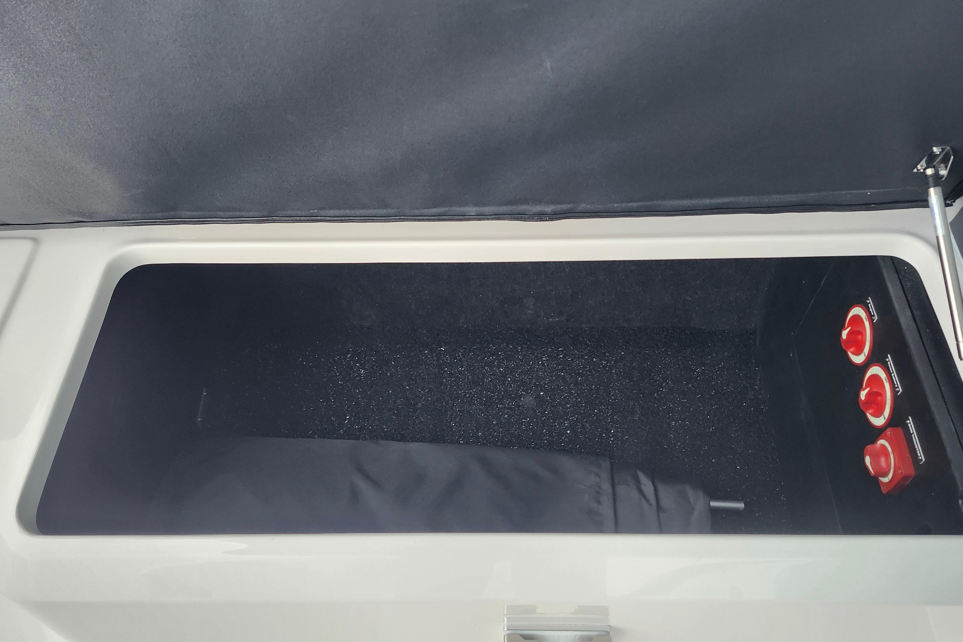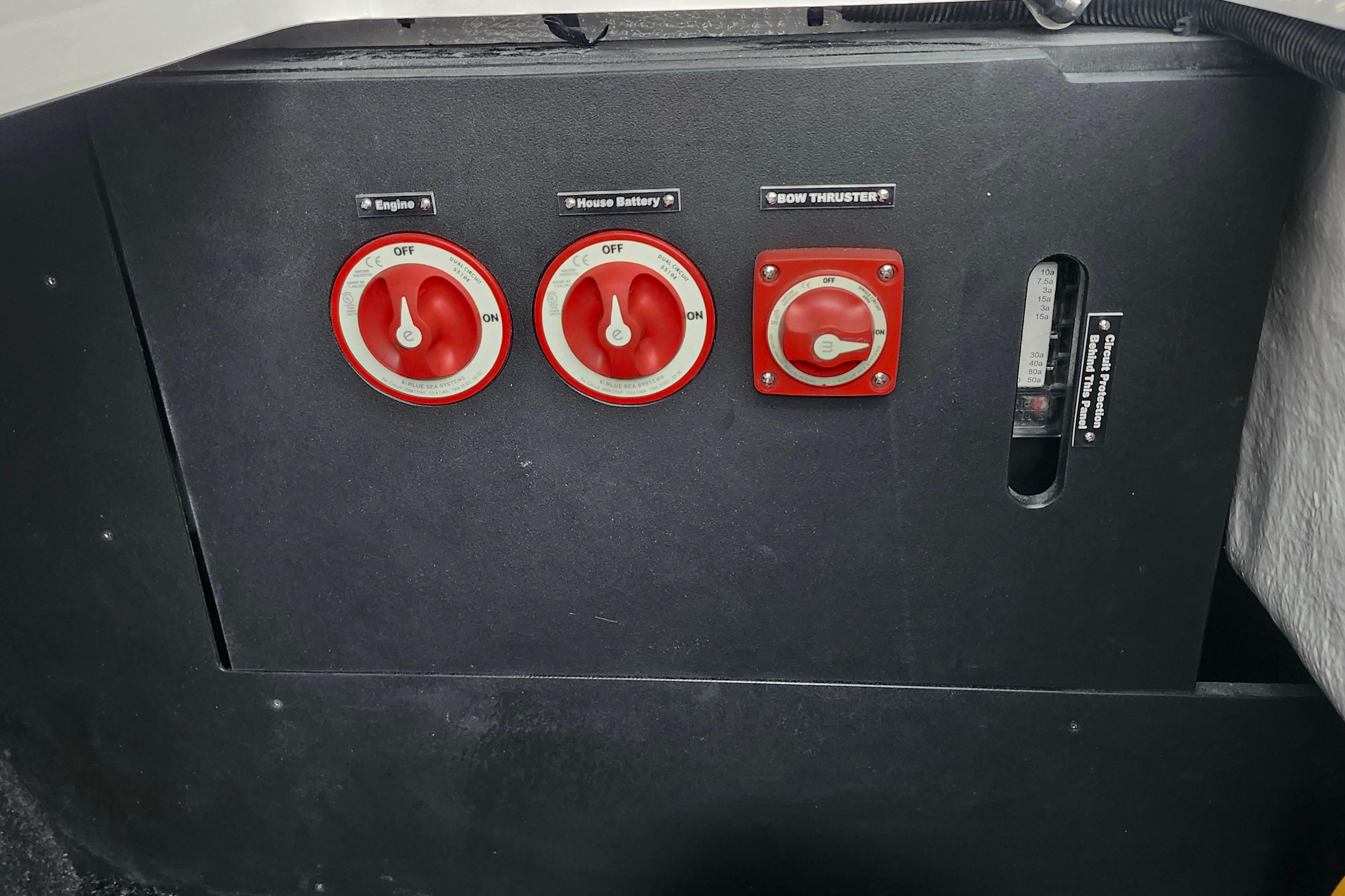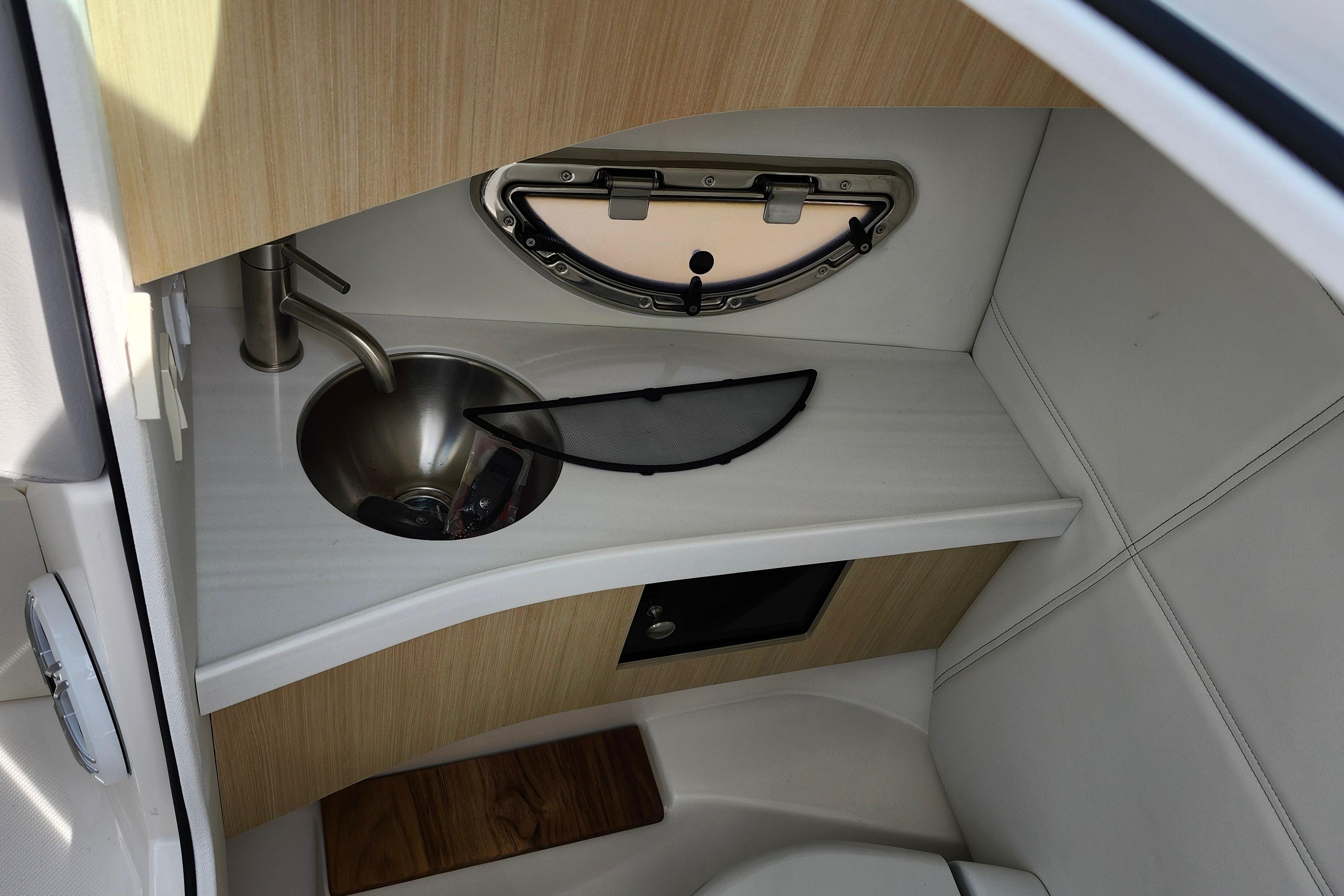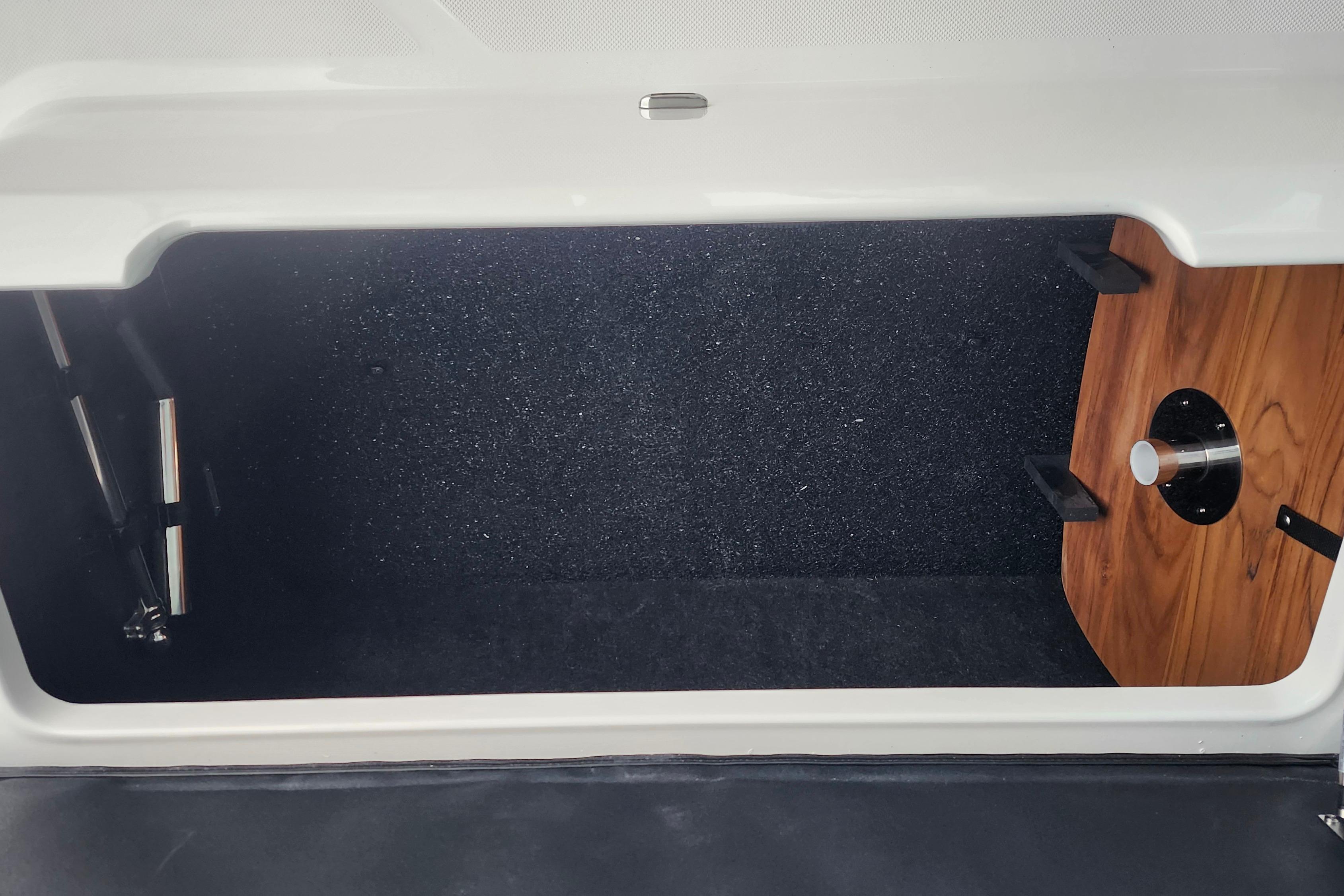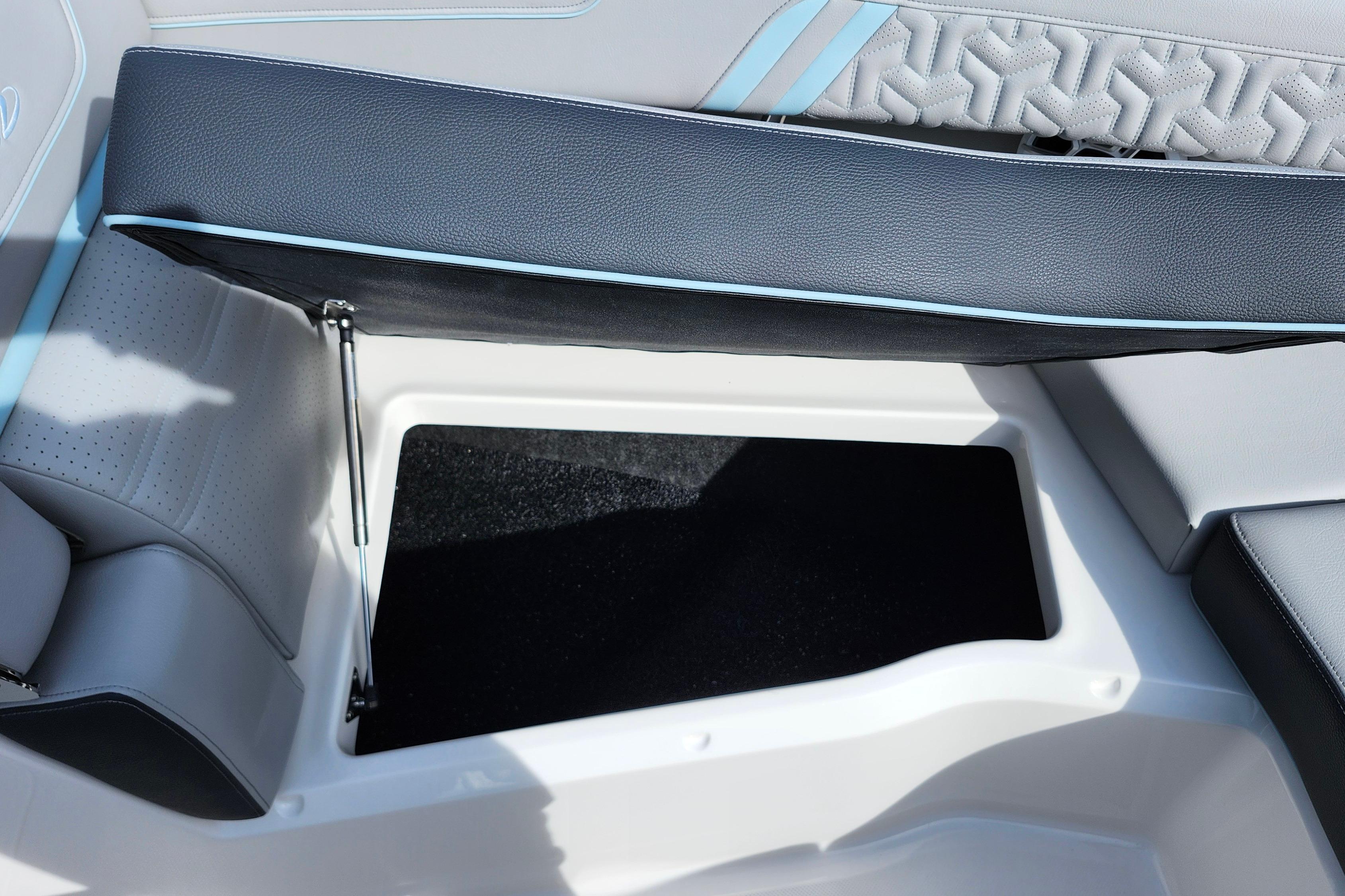 Some of the popular standard features include custom interior with belle isle blue accents, Yamaha Helm Master with Joystick, digital switching, bow thruster, transom shower, bow walk-thru doors, stereo performance and lighting package, dual Garmin 1243XSV with B60 transducer and stainless steel flag pole.