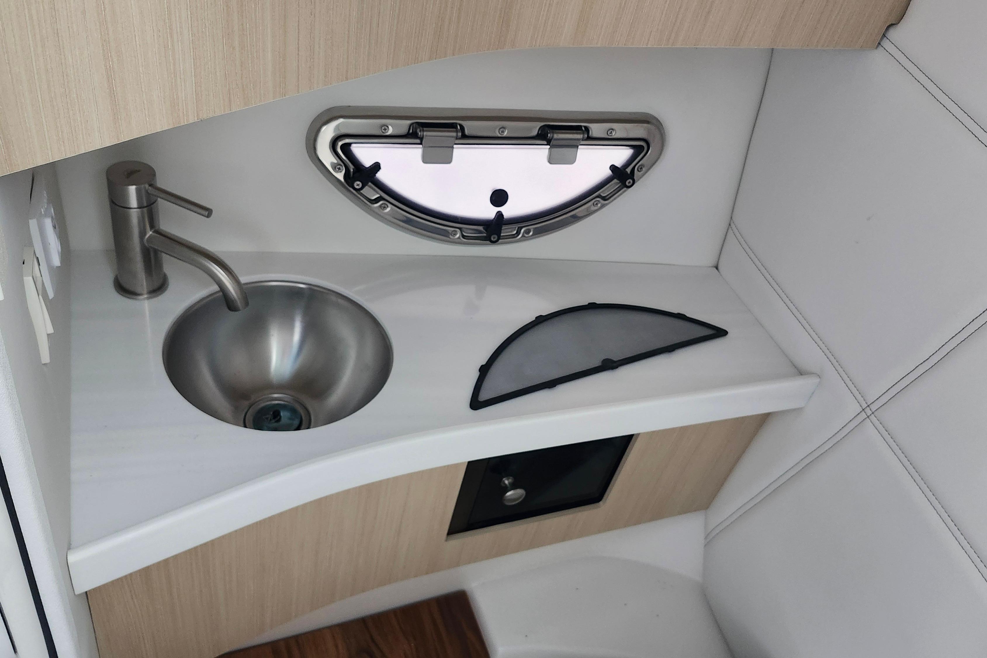 This Regal LX9 Ultimate is here under shrink wrap but can be opened with an appointment. It is loaded with the most popular options and the hull is white with belle isle blue boot stripe. It is powered by twin Yamaha F250 V6 4.2L white engines with integrated steering and Yamaha Helm Master with joystick. Options include manual bow sunshade system, black travel storage cover, battery charger, electric toilet with pump out fittings, half moon port light for head, anchor windlass with rope and chain, docking lights, fender clips, Garmin 943 companion GPS screen, teak cockpit table and Power HardTop with belle isle blue underside.