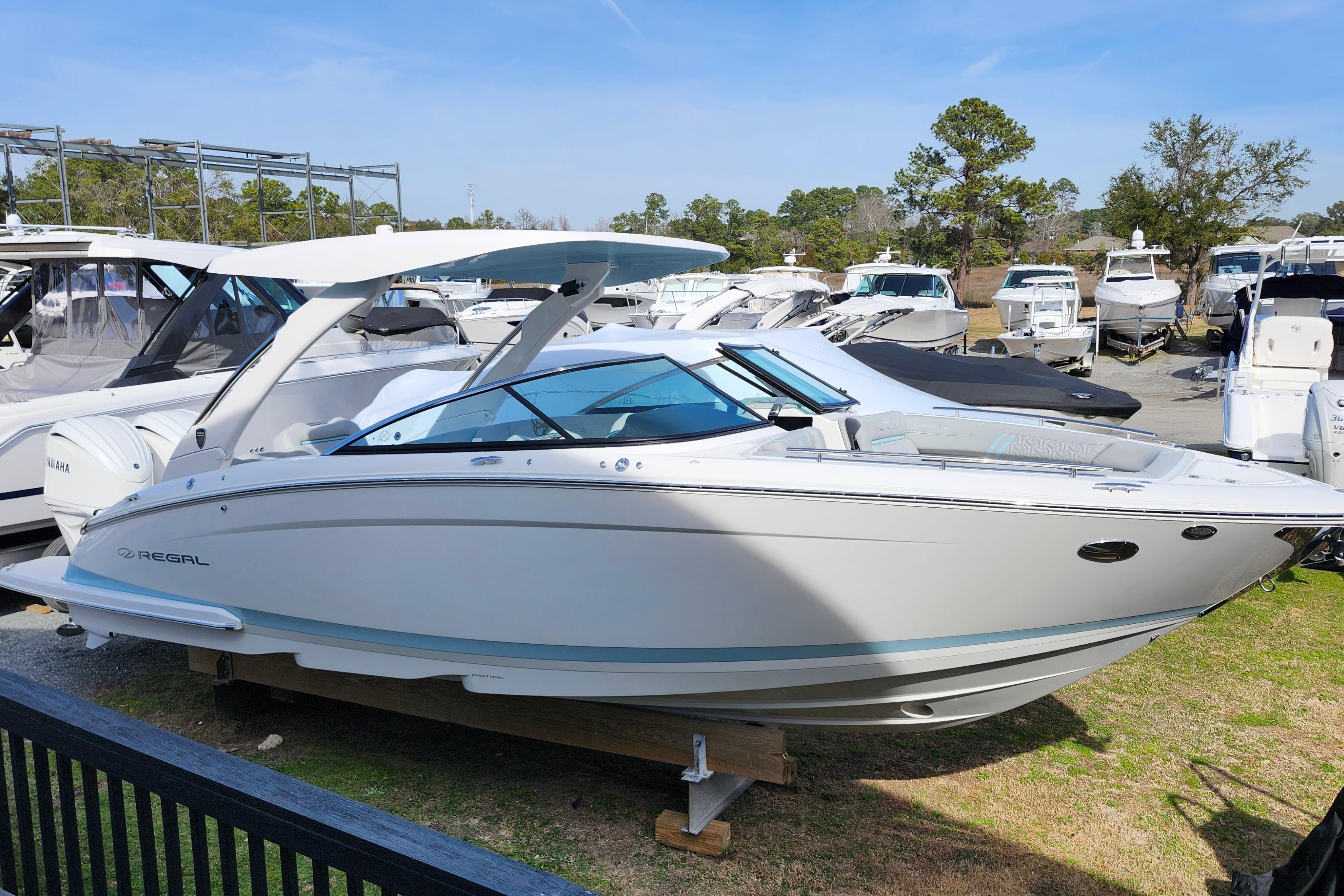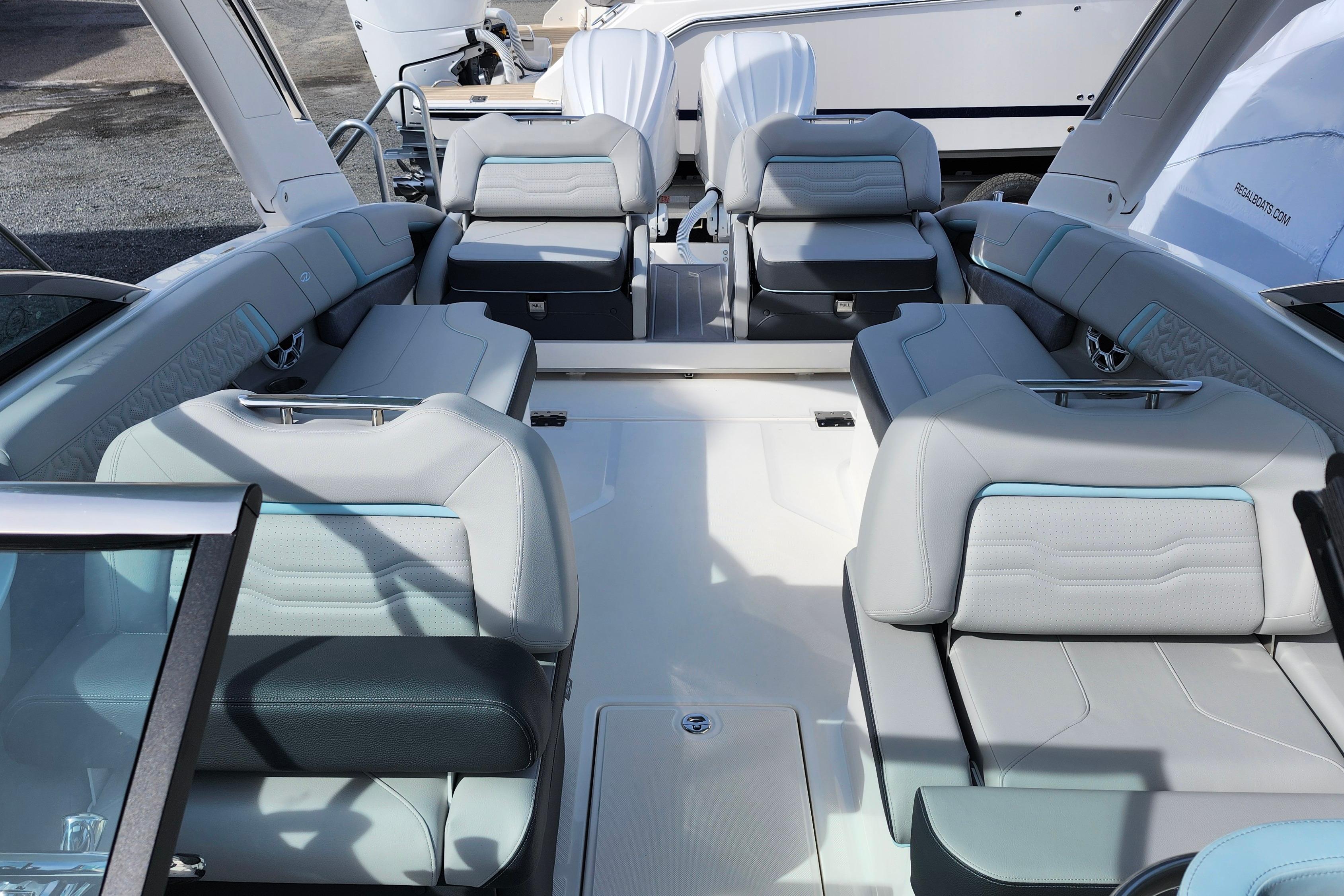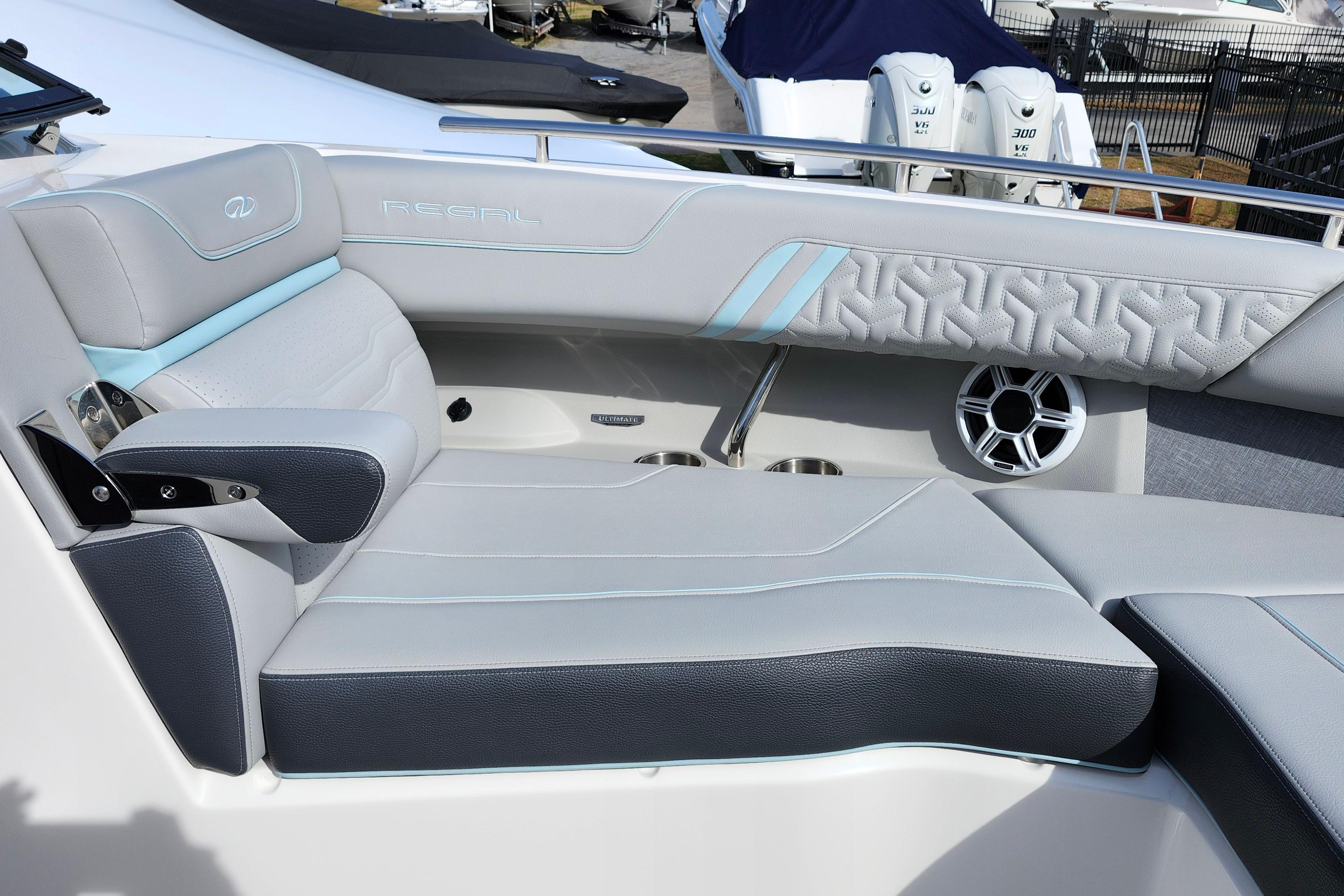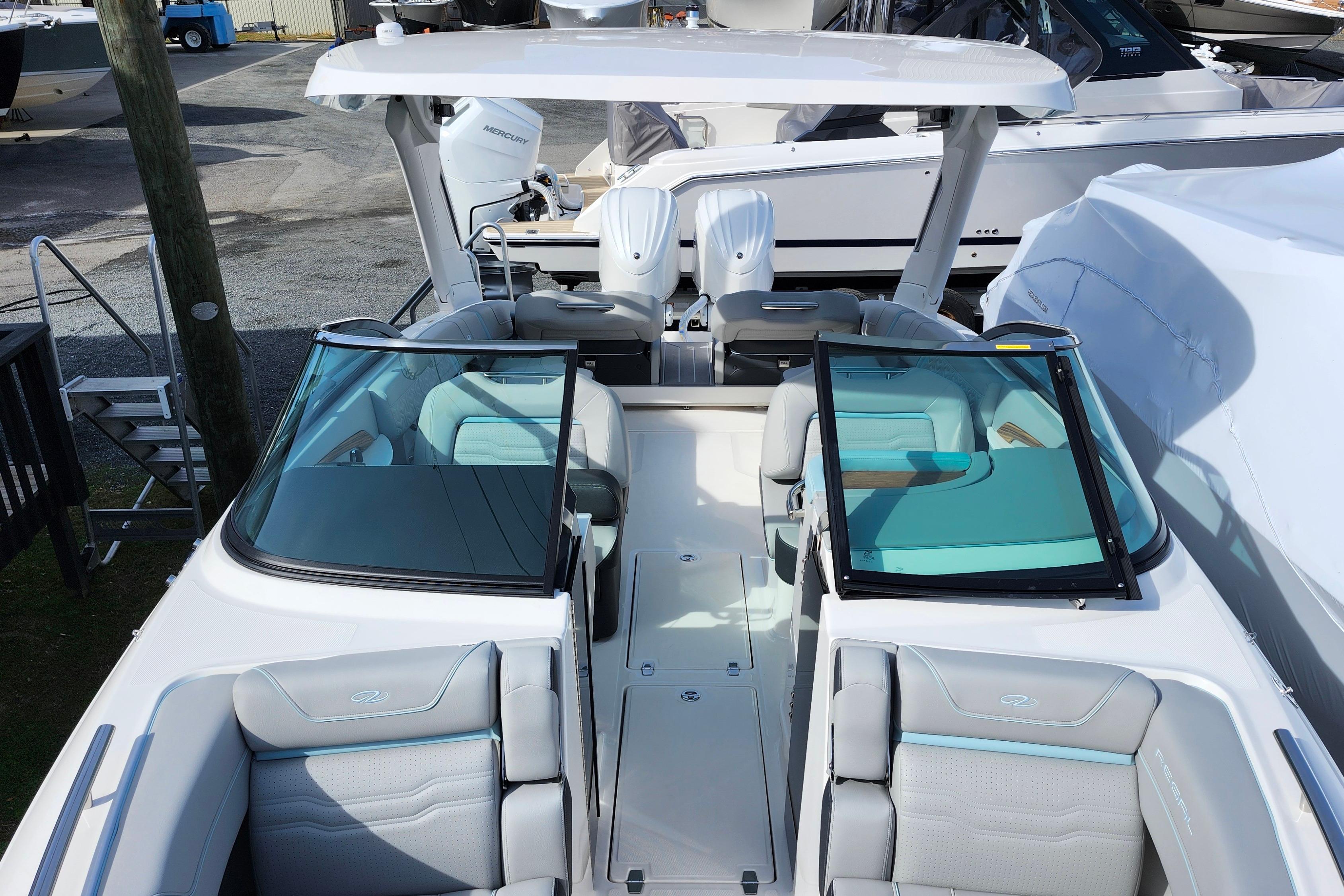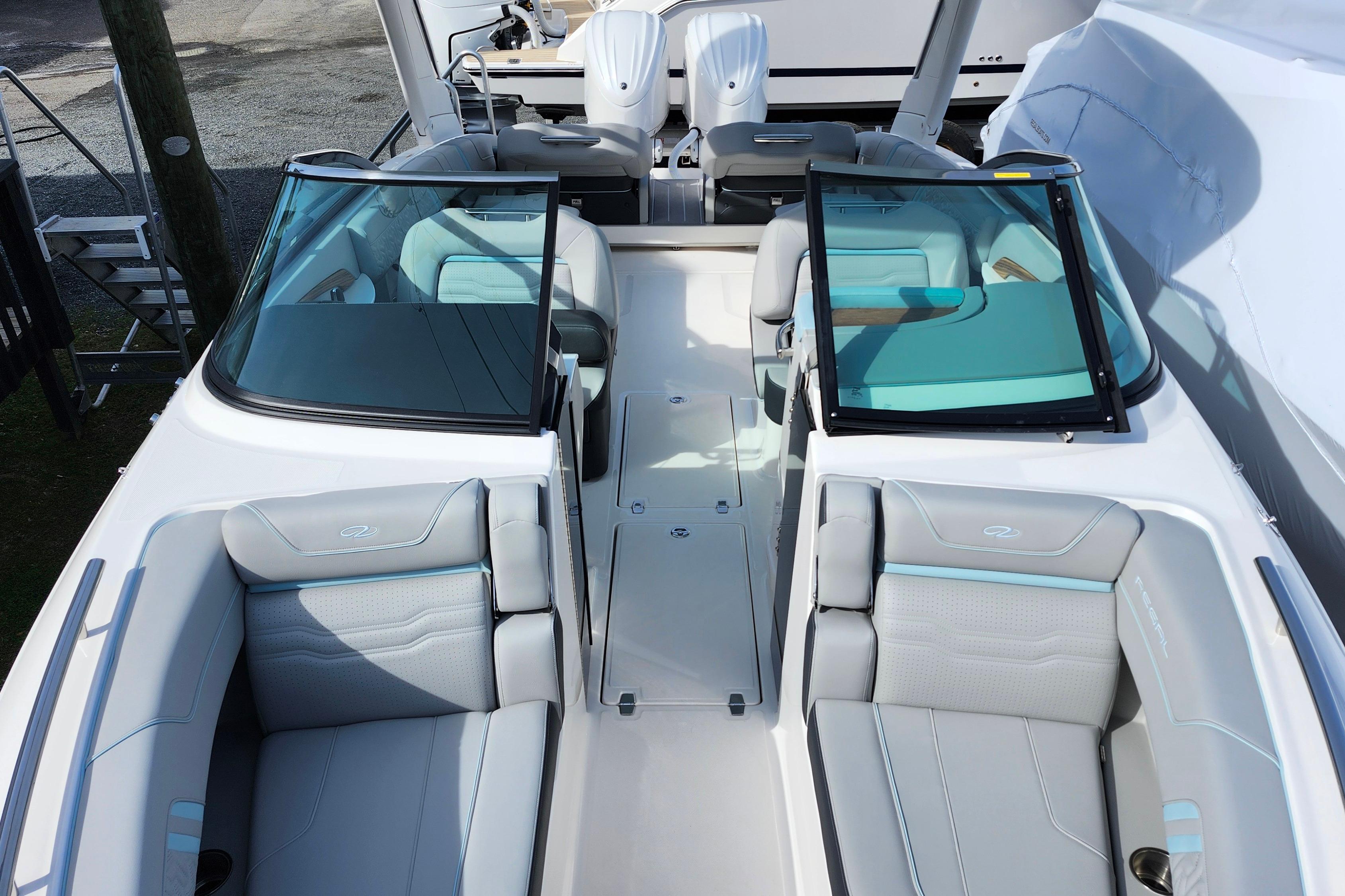 This Regal LX9 Ultimate is here to view. It is loaded with the most popular options and the hull is white with belle isle blue boot stripe. It is powered by twin Yamaha F250 V6 4.2L white engines with integrated steering and Yamaha Helm Master with joystick. Options include manual bow sunshade system, black travel storage cover, battery charger, electric toilet with pump out fittings, half moon port light for head, anchor windlass with rope and chain, docking lights, fender clips, Garmin 943 companion GPS screen, teak cockpit table and Power HardTop with belle isle blue underside.