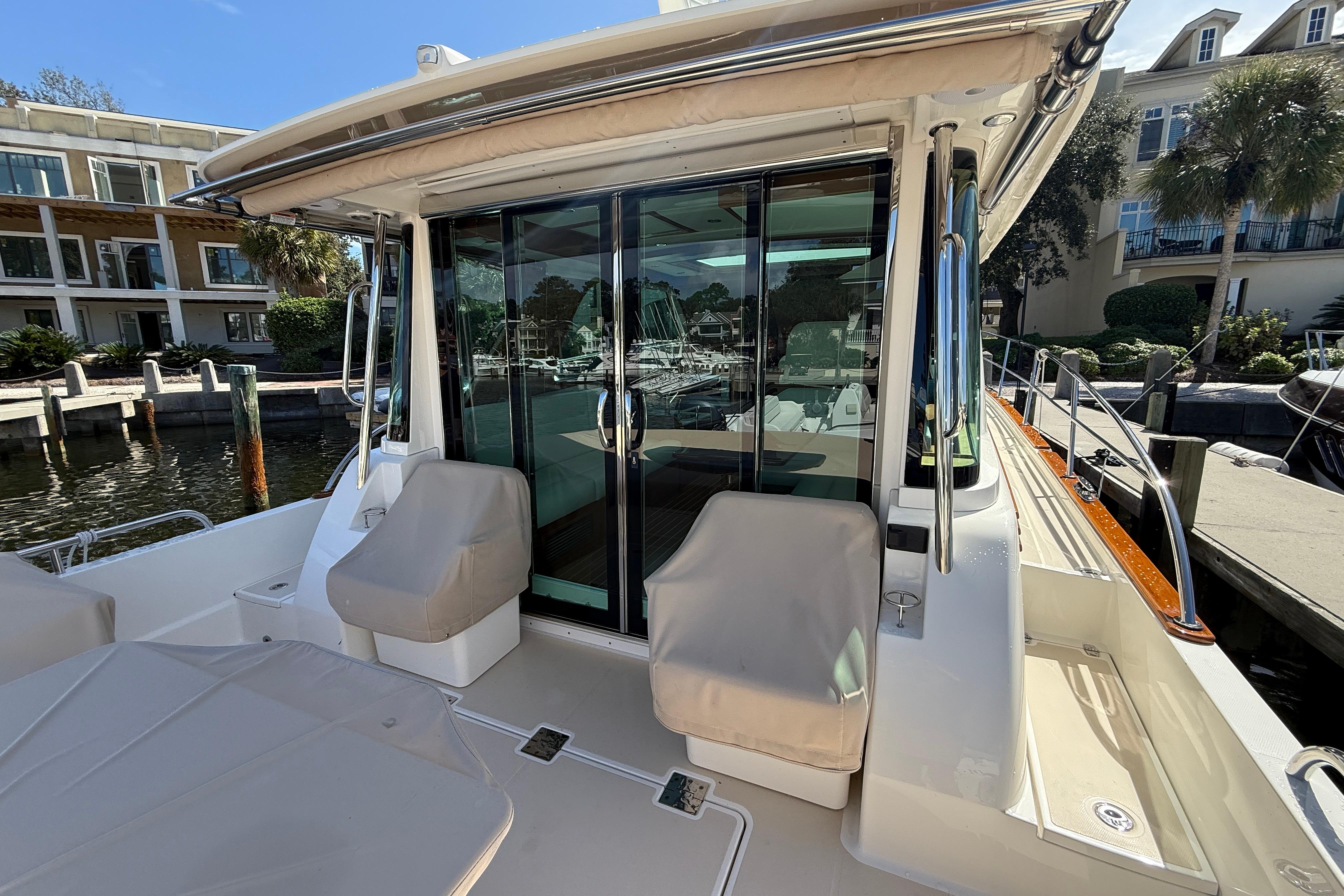 “The Sabre 43 is the first-of-her-size fully networked boat in the Sabre lineup, giving owner’s unprecedented authority over their experience. Owners can control any circuit, assign preset “modes of operation,” and monitor critical functions from the Helm MFDs, onboard iPad mini, or remotely via Sentinel Telematics smartphone app.