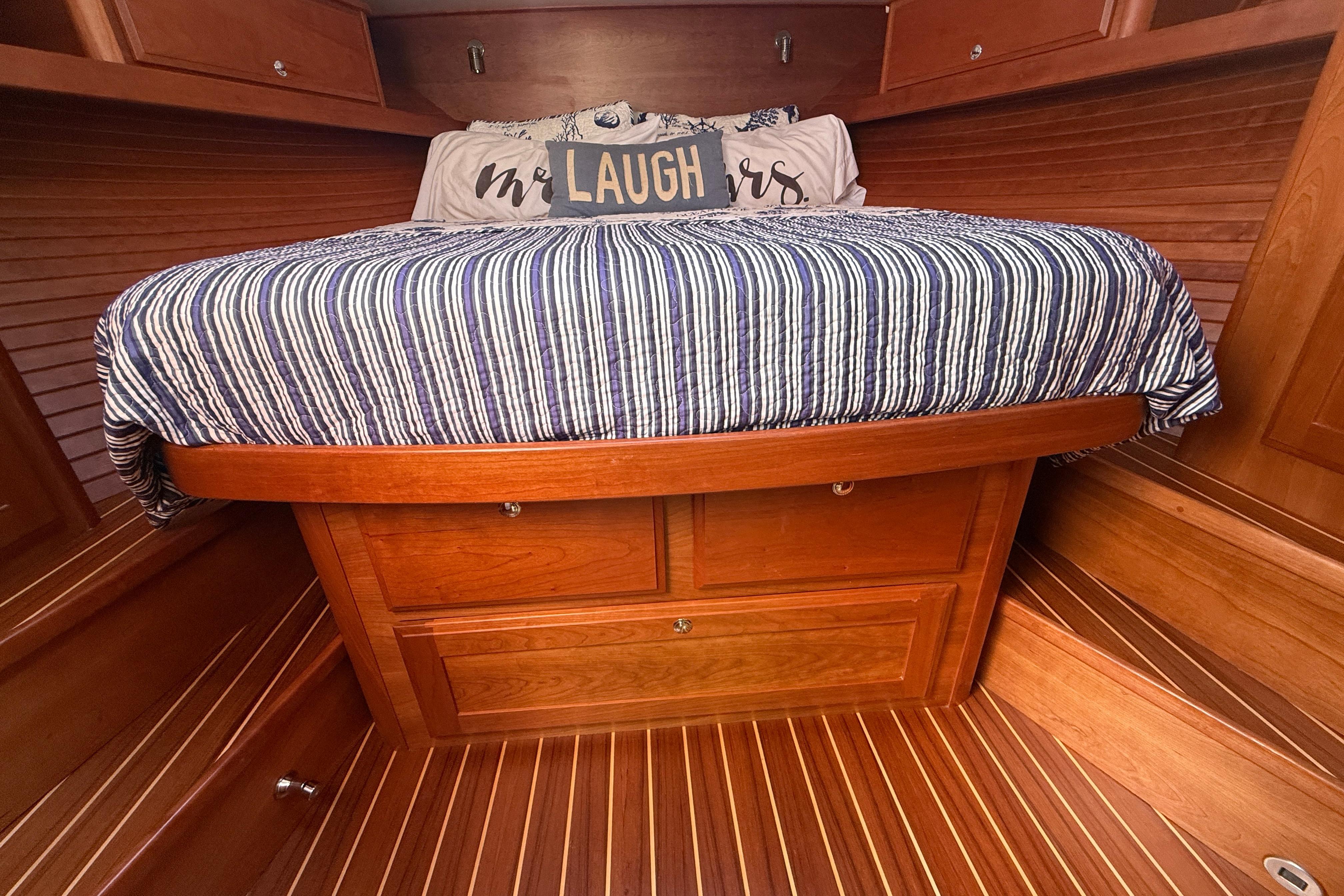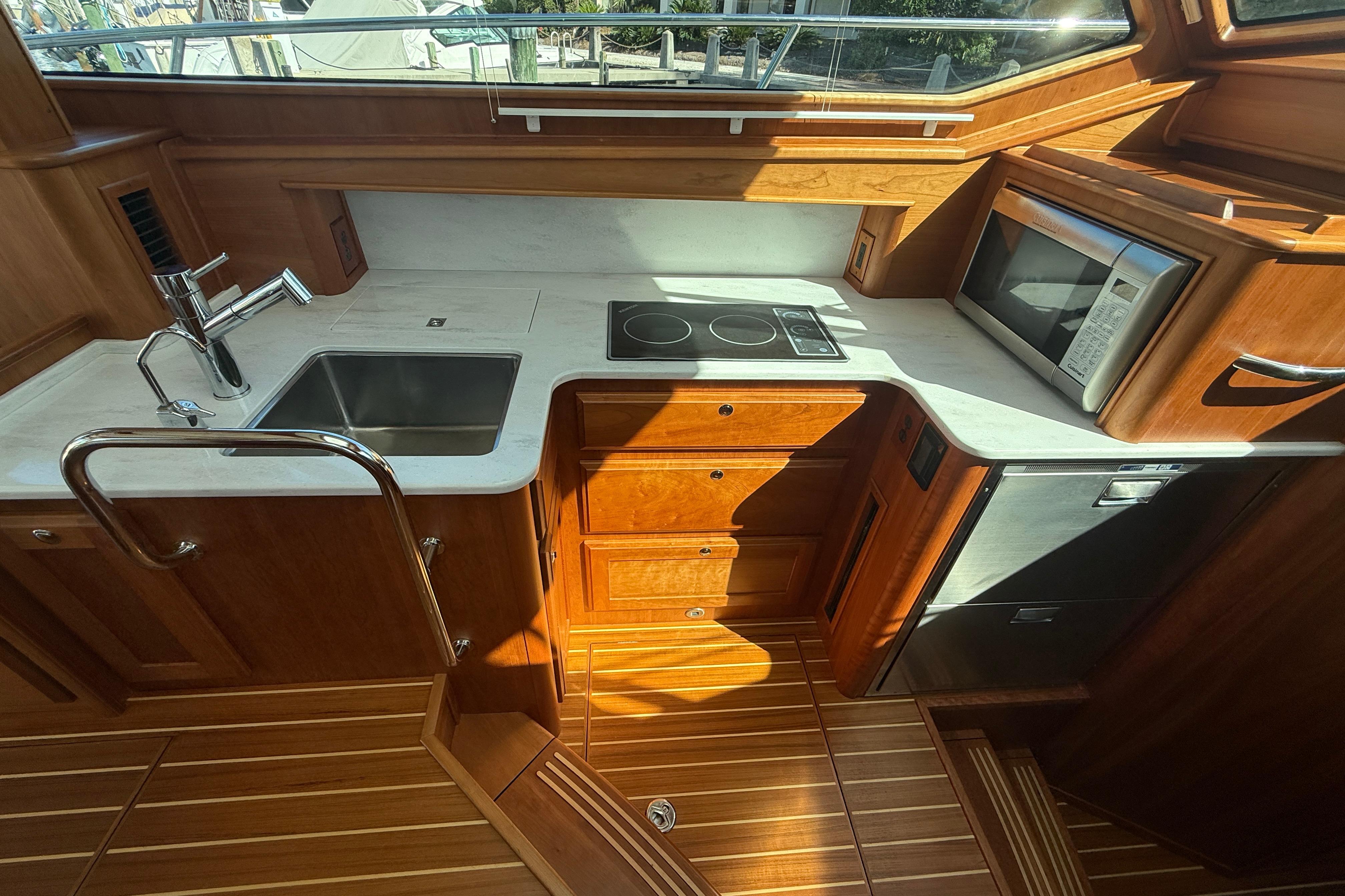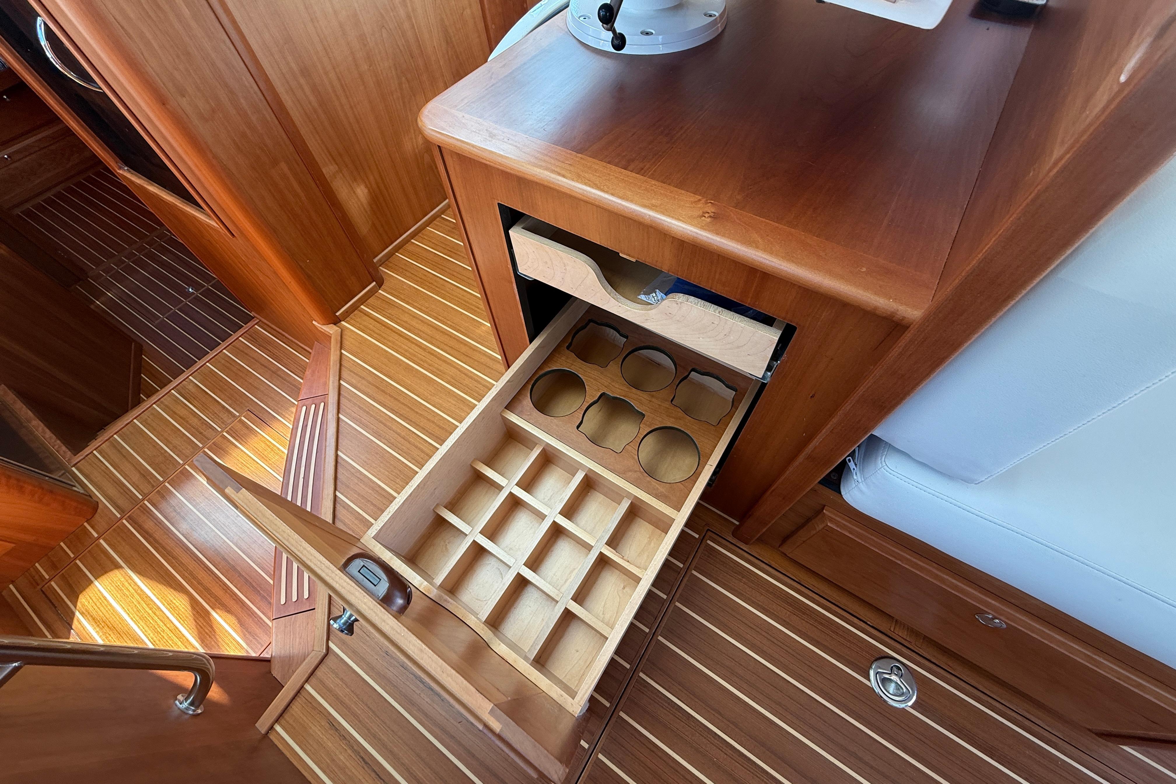 Storage is an oft-noted need in vessels of this size, and the Sabre 43 delivers. A hatch in the salon sole provides access to the multipurpose Utility Space, which offers various supplemental storage and appliance options, including storage lockers, wine cooler, or even separate side-by-side washer and dryer units.”