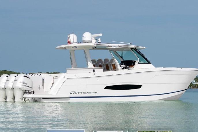 This 2026 Regal 38 SAV Ultimate is currently on order and anticipated to arrive beginning of March. It can be built to your colors and specs! Selected options currently are triple Mercury 425 V10 5.7L Verado engines. It has a white hull with med blue boot stripe. It has a custom grey, white with med blue accent interior. Other options include bow seat covers, full enclosure, fish package (livewell, transom rod holders and raw water washdown), toilet overboard discharge, fender clips, outrigger bases, hardtop rocket launchers, mid cabin tv, JL Audio ultimate audio package, high gloss teak cockpit table and high gloss teak bow table.